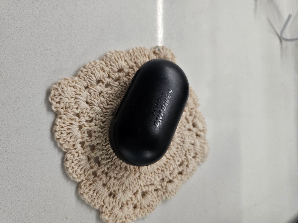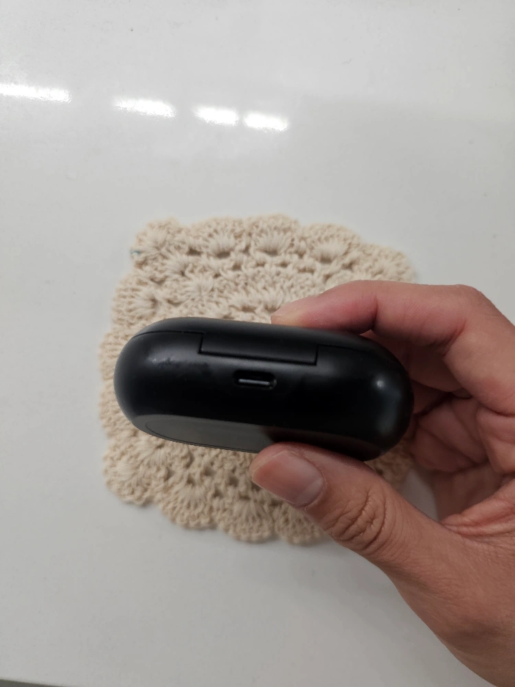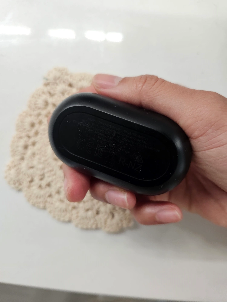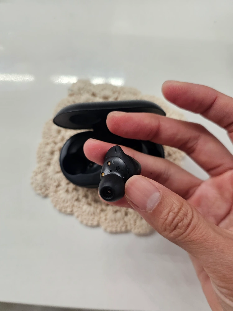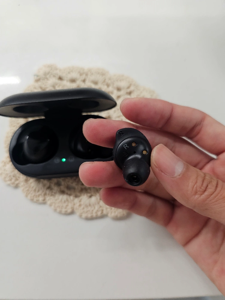 Stylish wireless earbuds in black. Comes with a charging case. Enjoy listening to music with these comfortable earbuds and let your stress melt away. The earbuds are wireless. I am using headphones 🎧