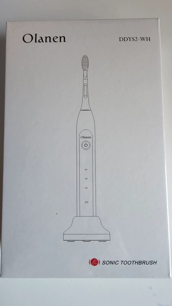Olanen Sonic Toothbrush. White box with a toothbrush graphic. Features a charging stand. Side panel includes icons indicating 3 brushing modes, sonic cleaning system, 30 days of battery life, and waterproof. Using this item each morning can be a truly relaxing experience.