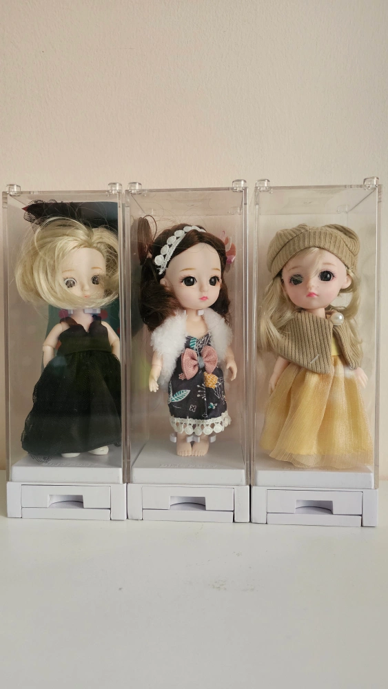Three miniature dolls with detailed facial features. Each doll is presented in its own display case. Such a charming set can be used to create an eye-catching centerpiece for any room. $13 each obo.