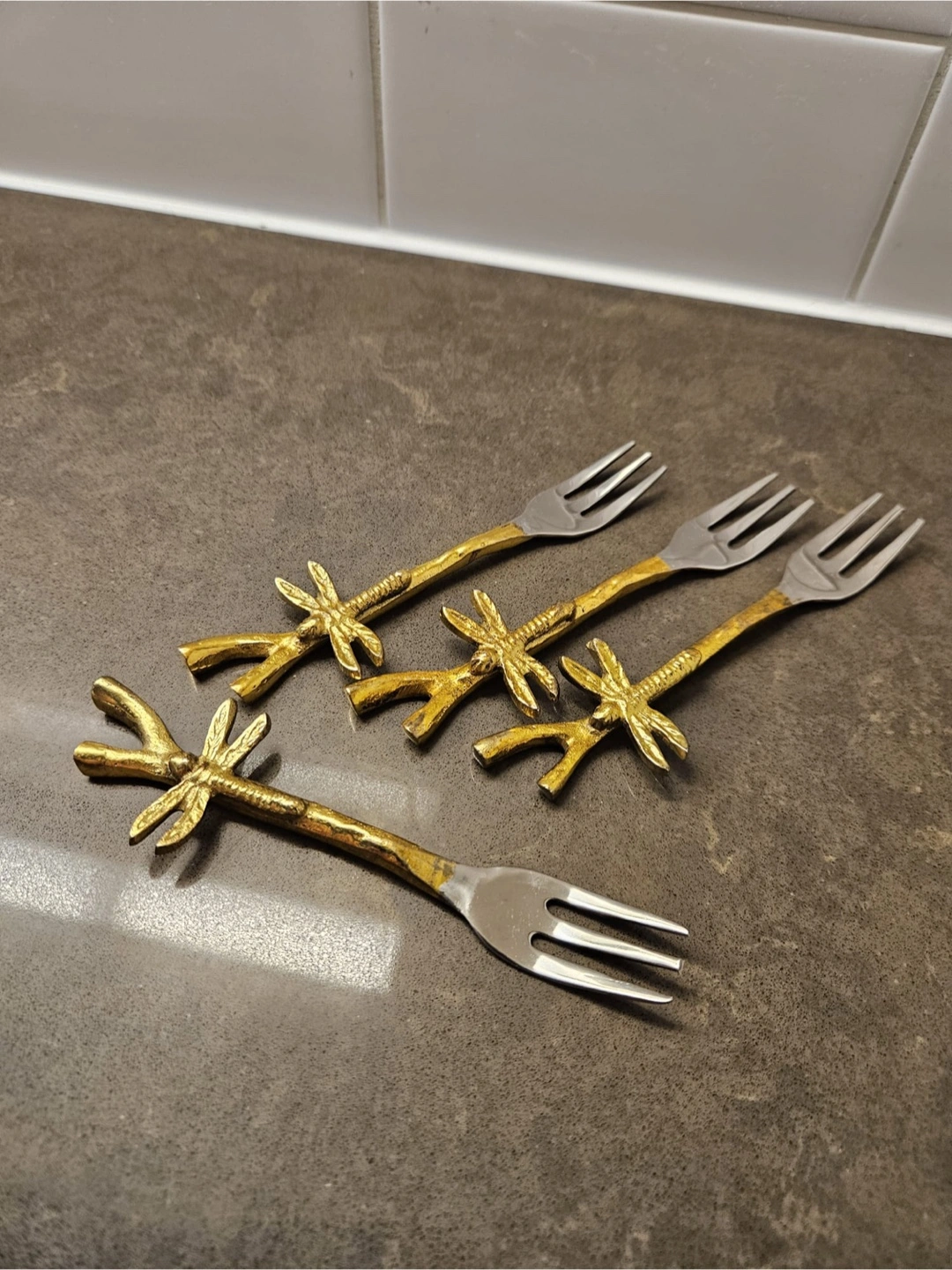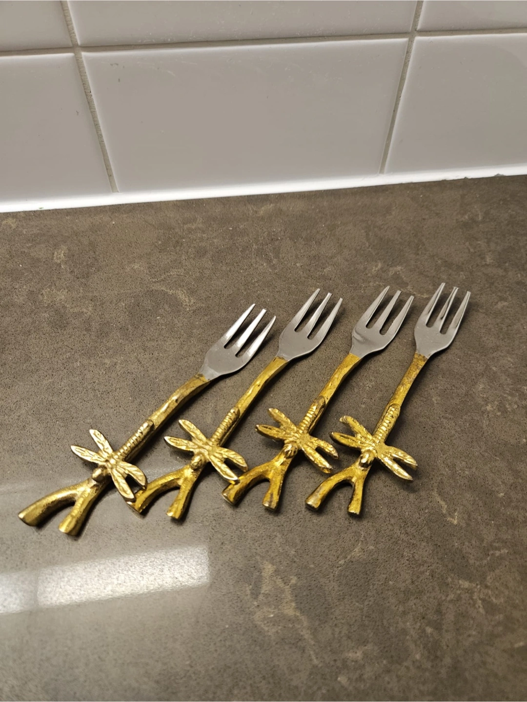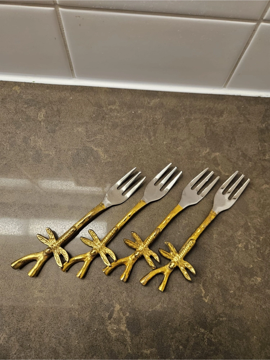 Set of four decorative forks. Silver tines with golden handles. Each handle features a decorative design. These forks can really help elevate any table setting, adding a touch of elegance to your meal.