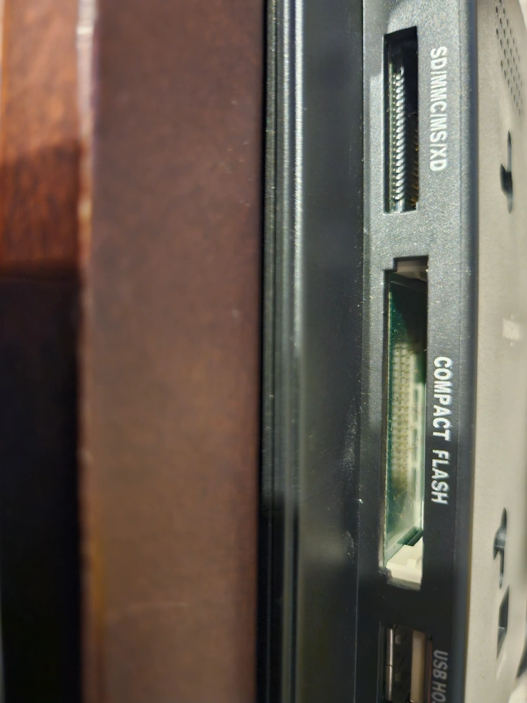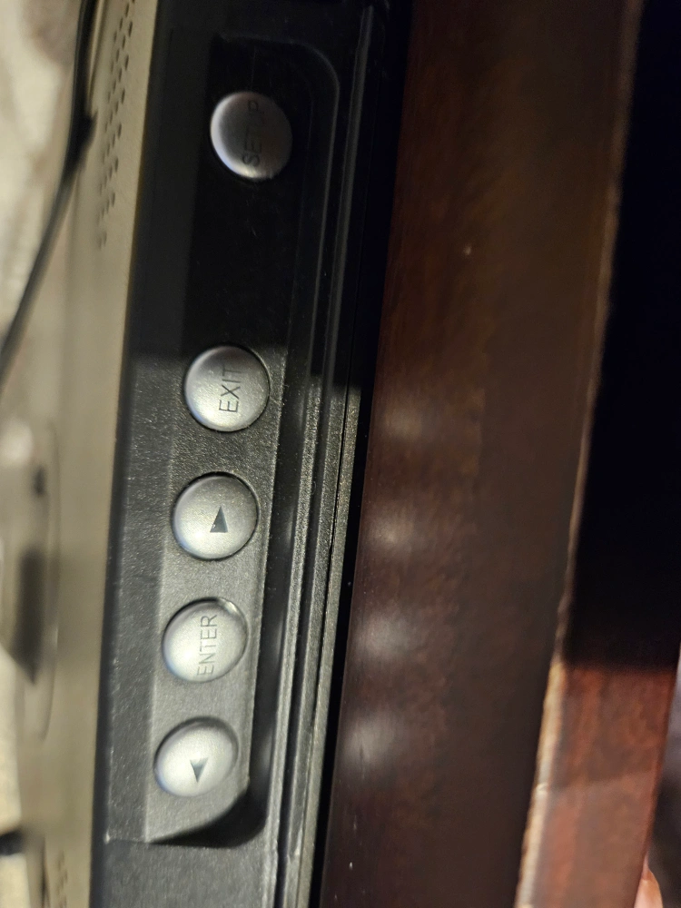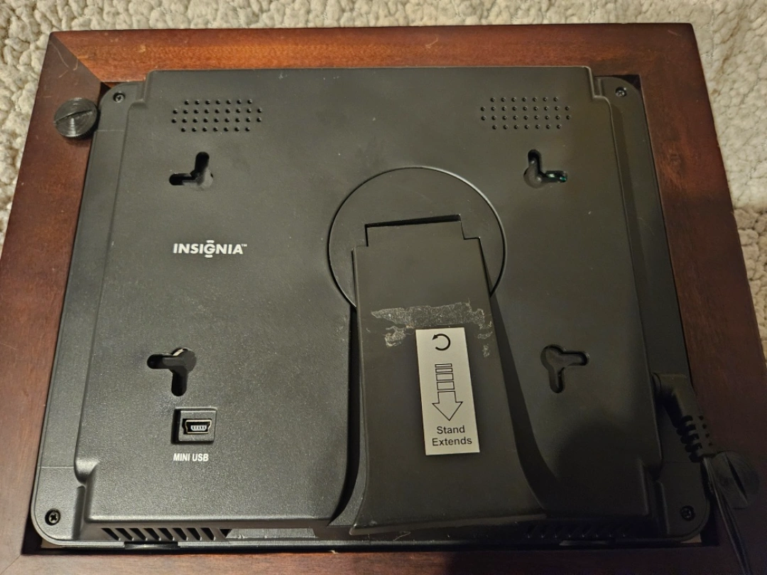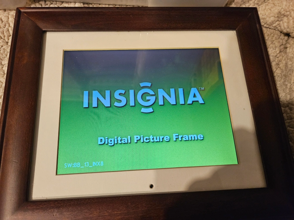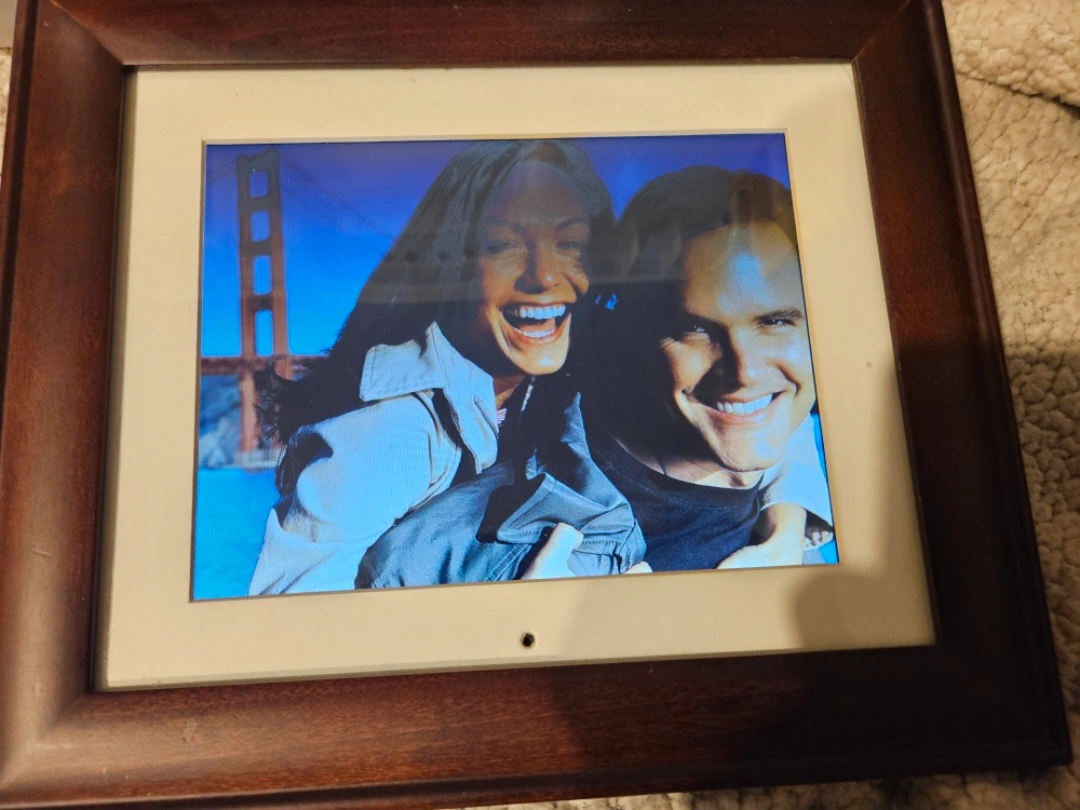 Digital picture frame with a dark wooden frame. Features a stand, and can be hung on the wall. Has a screen with a white border. Perfect for displaying photos of happy memories. Porch pickup Lawrence and Meadowvale area