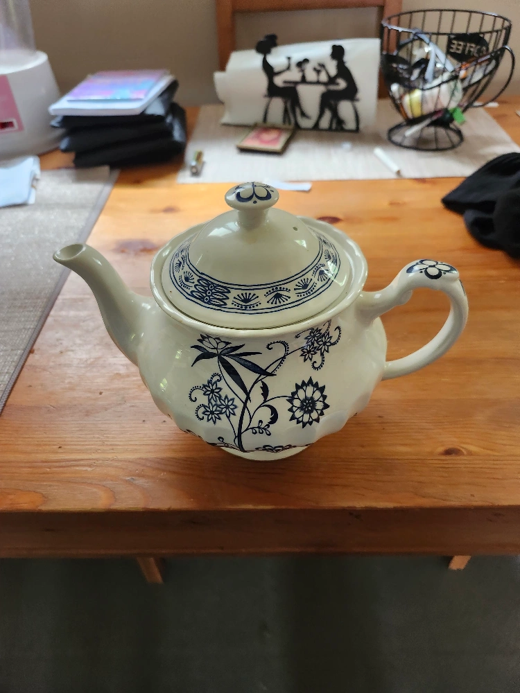 White J@G MEAKIN Blue Nor dic teapot with a blue floral pattern. Consider brewing your favorite tea in this lovely teapot to relax and unwind after a long day. MINT! Cups and saucers available also.