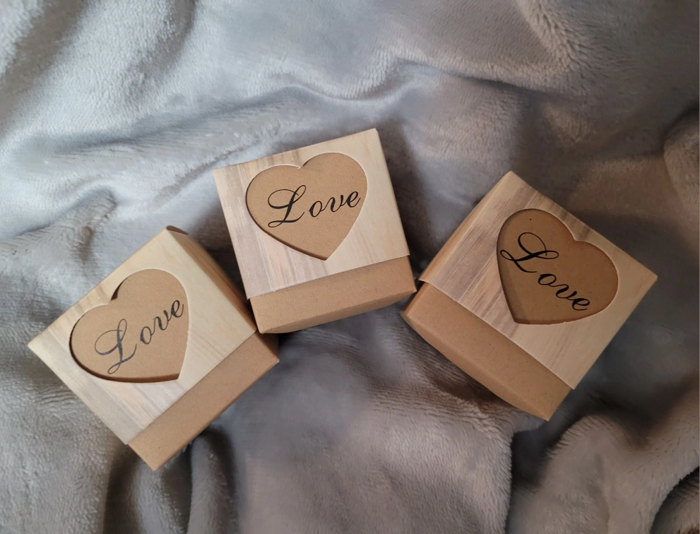 Wooden-themed paper favour boxes with a heart cutout on the lid. Heart shape cutouts showcase the word 'Love'. Great for holding small favours like candy or chocolate. Includes 98 pre-assembled boxes, and twine. Pickup is at Bayview Village Mall (Bayview and Sheppard)