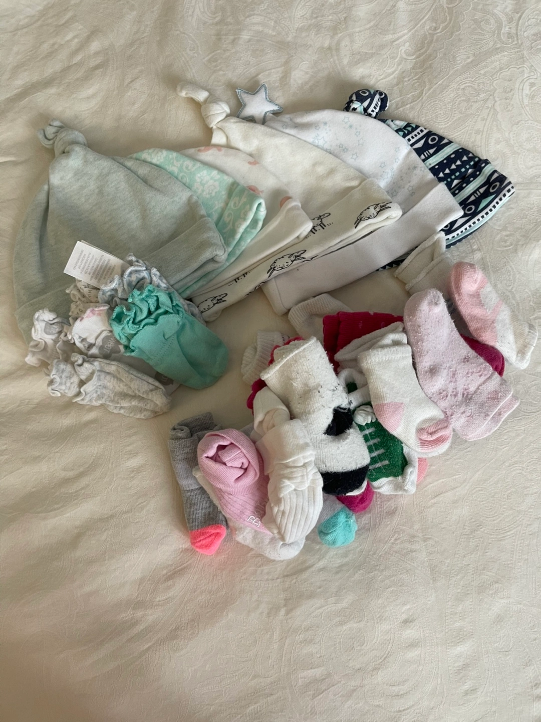 This delightful set of baby newborn- 9m accessories includes a variety of colorful socks and hats. Perfect for keeping your little ones cozy and stylish. They’re all great used condition. Carters , toys r us brand and some I don’t remember, oldnavy .