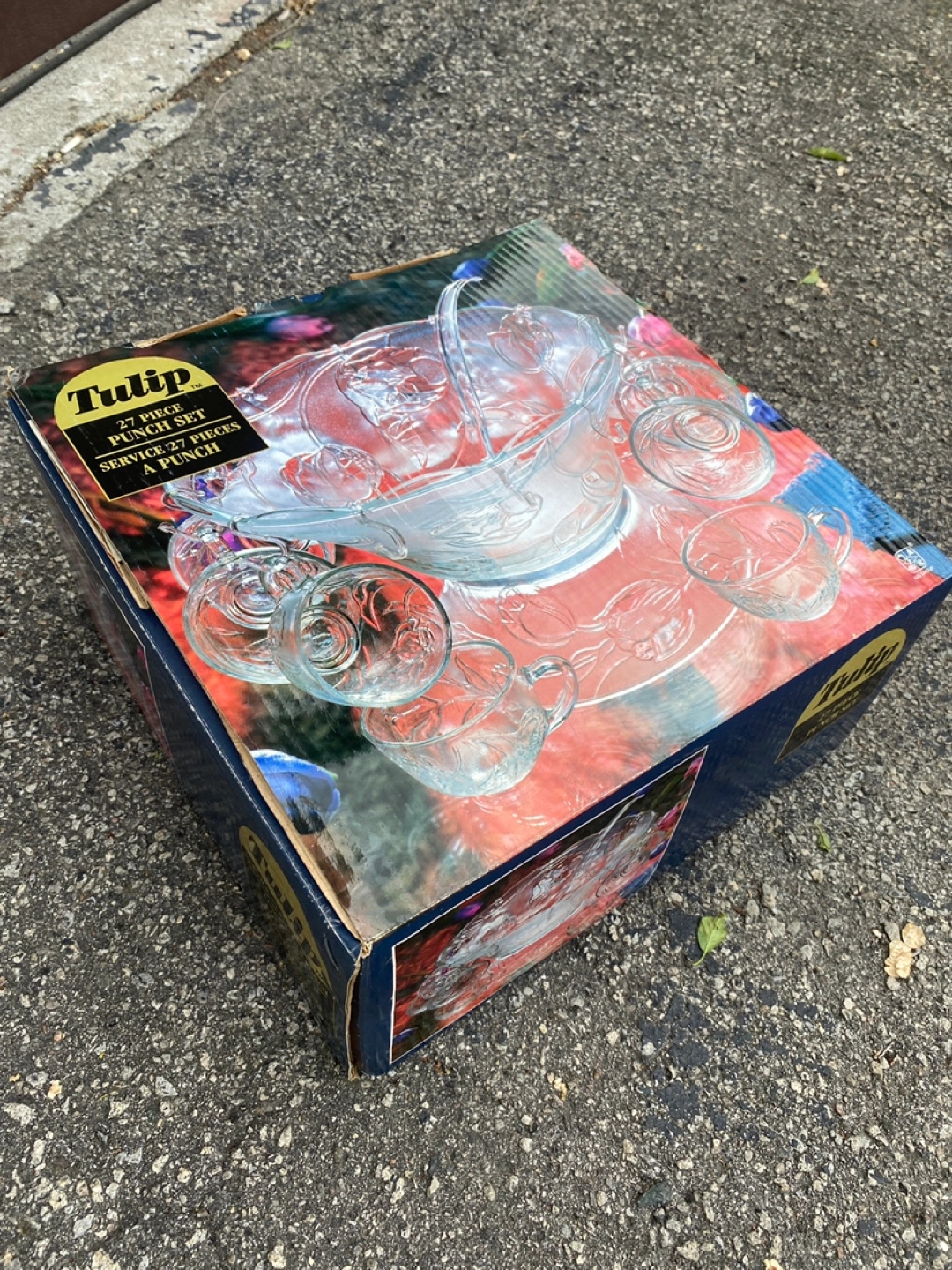 A 27 piece punch bowl set. Includes 2 punch bowls (one small & one large), 12 cups, a ladle, and 12 hooks to attach cups to hang from the edge of the large bowl. Features a floral tulip design. A perfect piece for your next gathering.