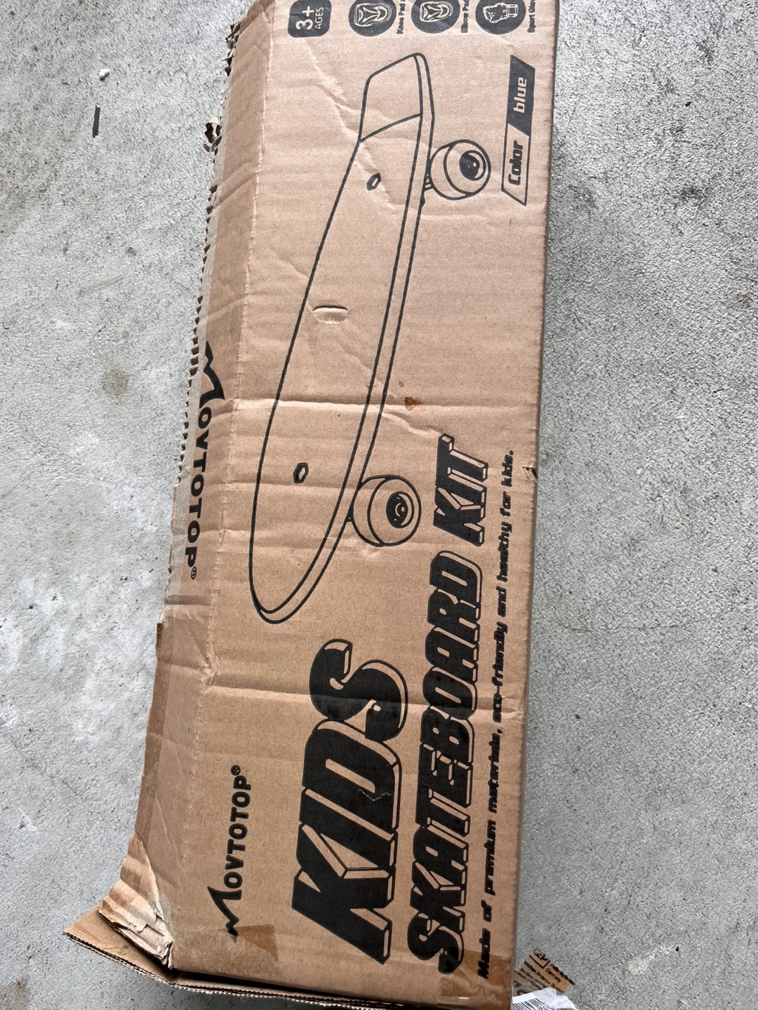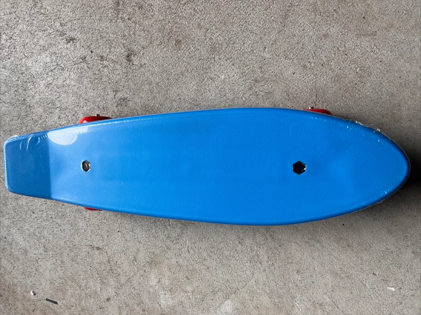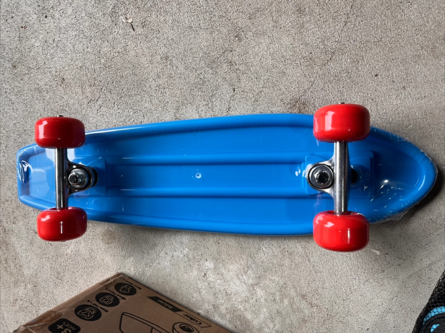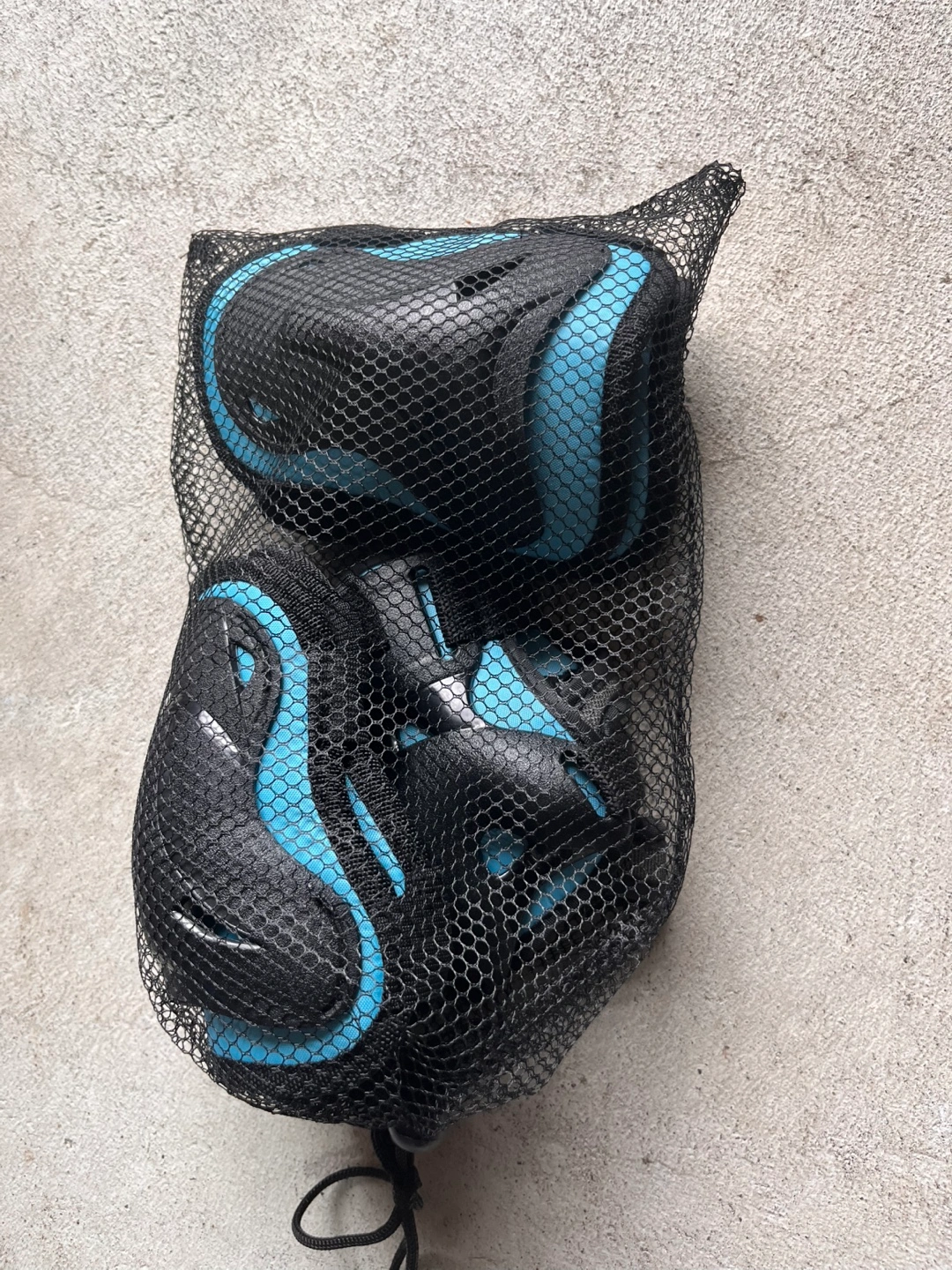 A cool blue skateboard with wheels. The skateboard is a good size for beginners. protective gear set include elbow pad, knee pad, and wrist pad Spending time outdoors