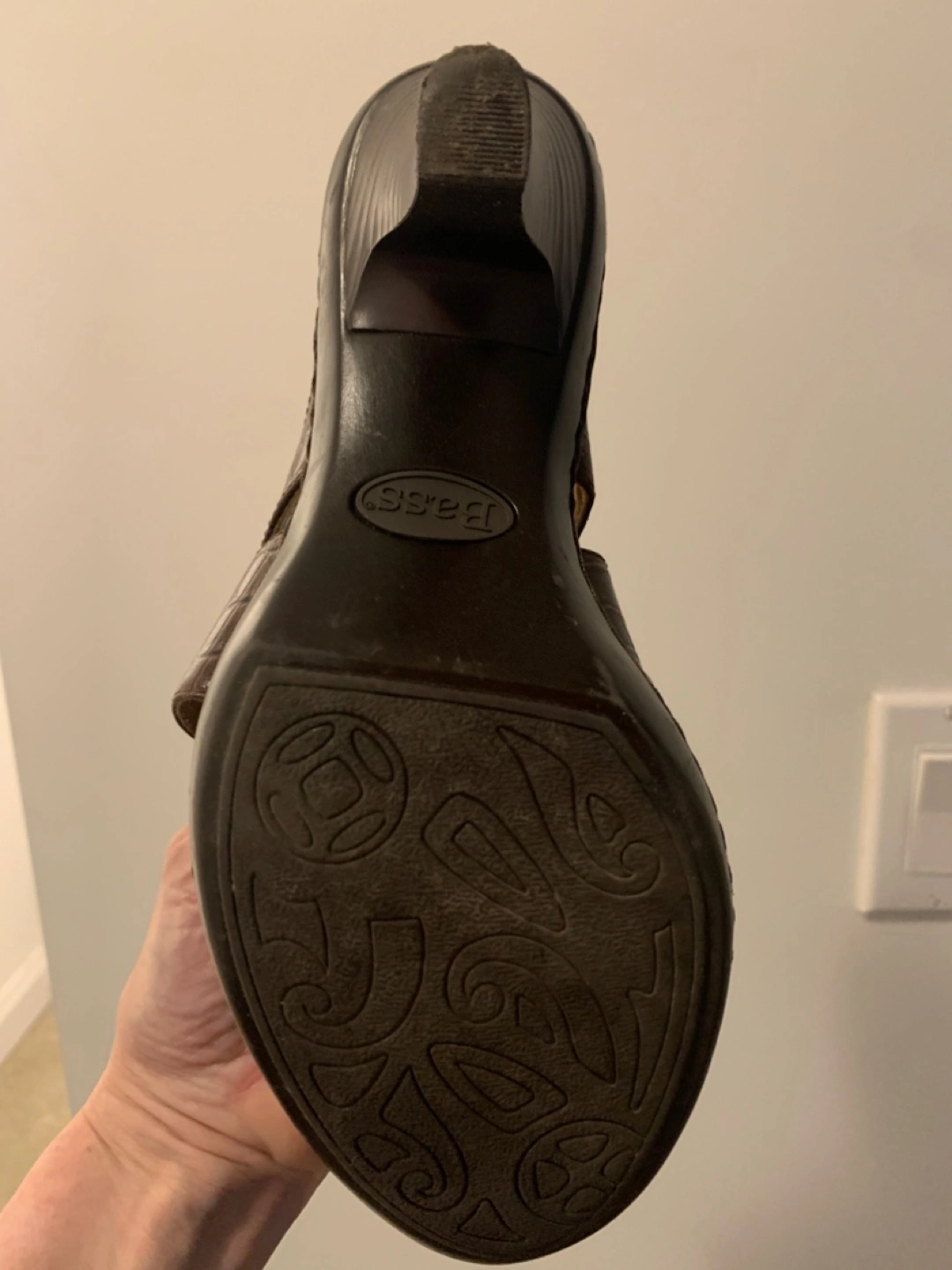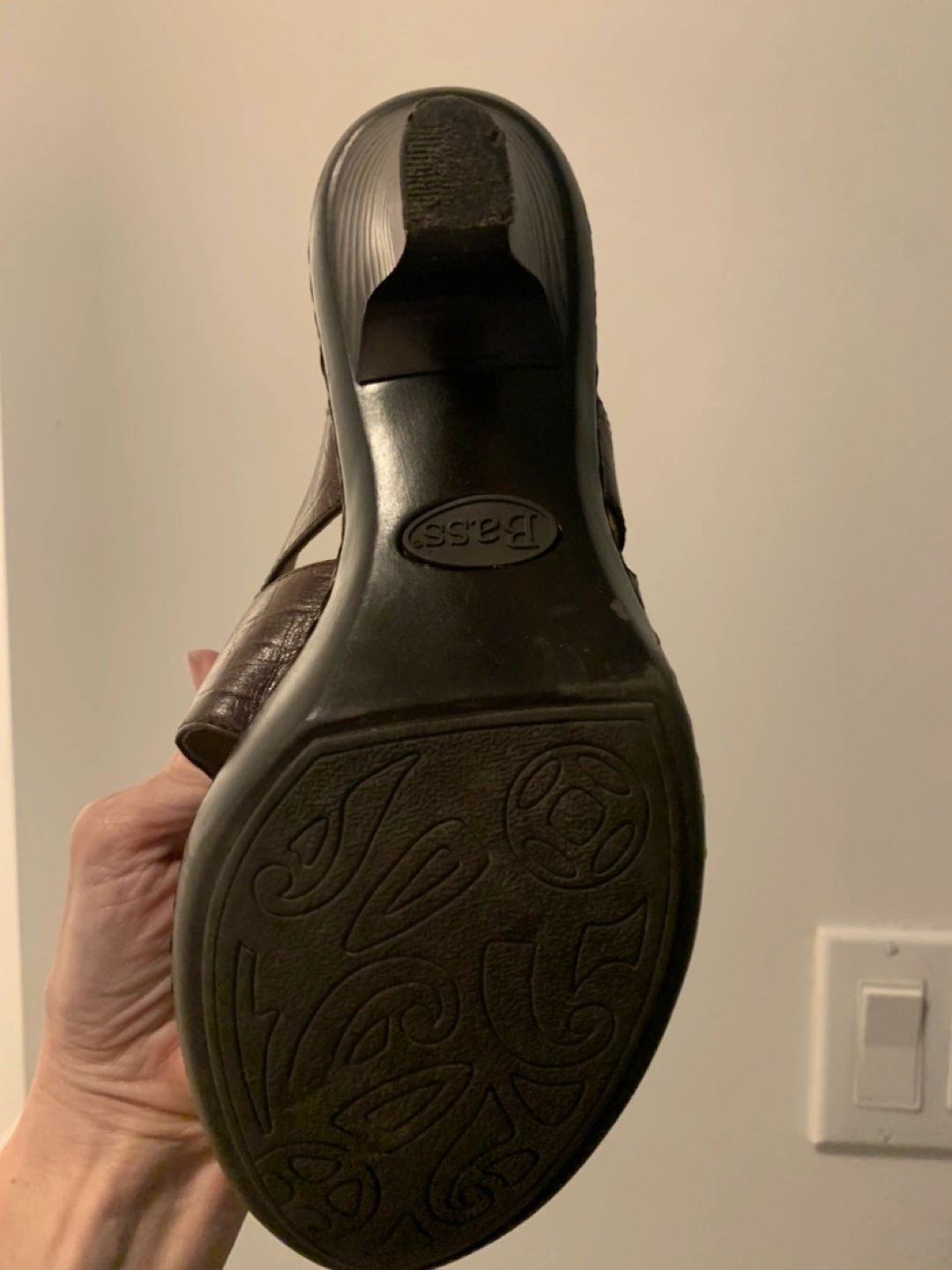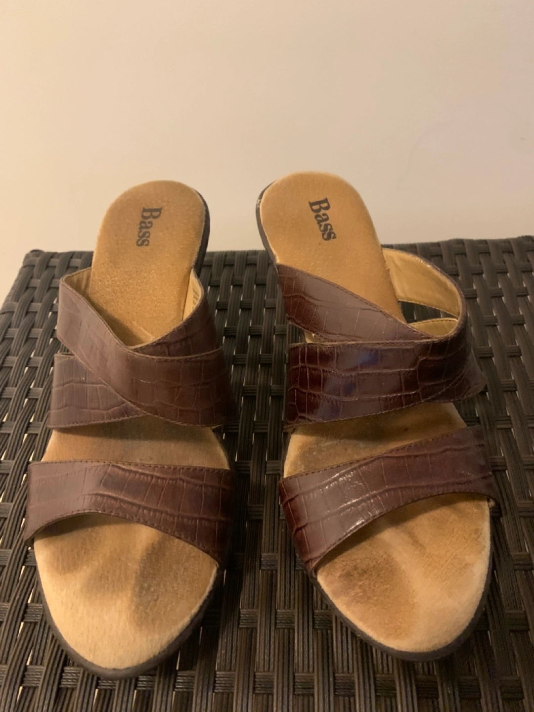 Size 8. Bass dark brown leather heeled sandals in excellent used condition. Only worn a couple of times. Unfortunately I don’t have the box. The inside of the shoes is cushioned and lovely. Heel is 3”. They fit true to size. Pick up in Roncesvalles. No Holds Please. Same Day/Next Day pick up preferred.