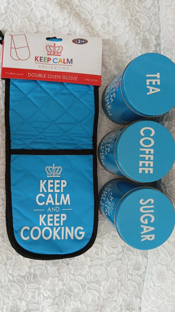 Set of canisters, each with a different word, and an oven glove. Features the phrase “Keep Calm” on both the canisters and the oven glove. all 4 pieces for $5.00. porch pickup at Dufferin and Bloor st