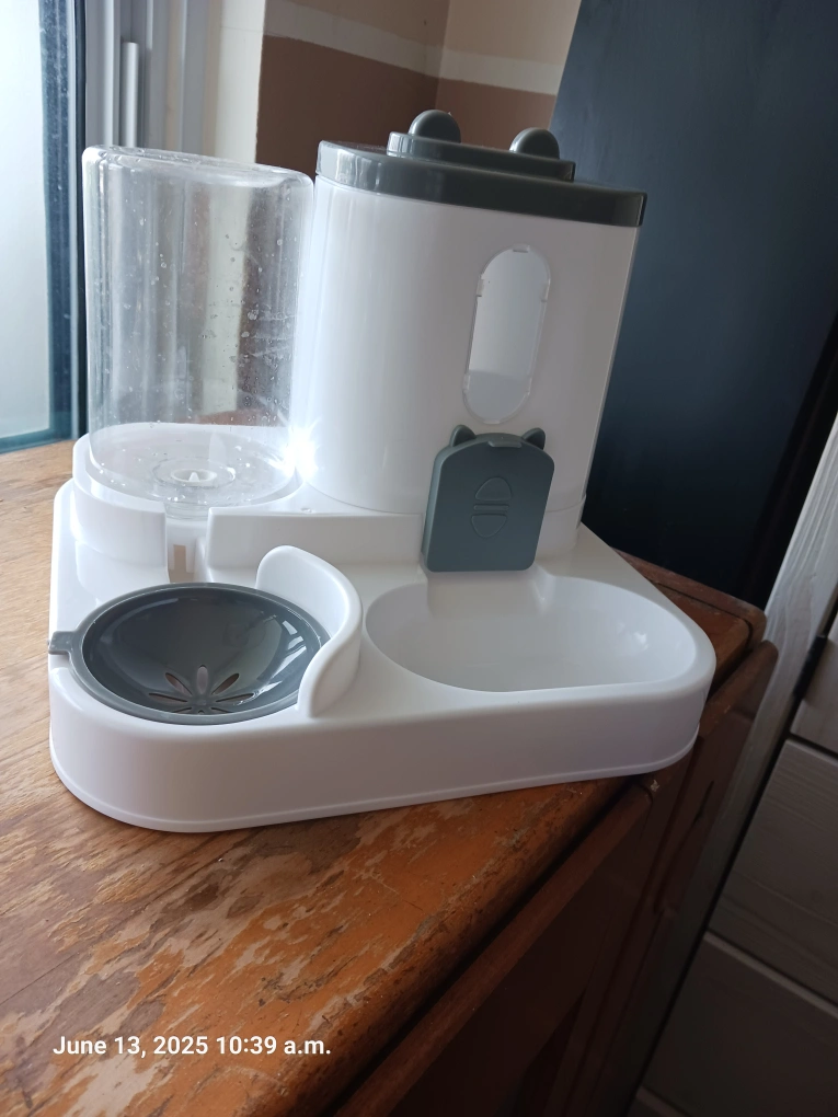 A pet feeder and water dispenser. It includes a food storage compartment, a water dispenser, and two bowls for food and water. It will ensure your pet is well fed and hydrated throughout the day, offering you peace of mind.