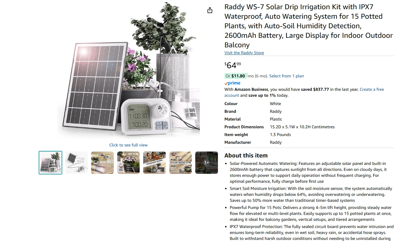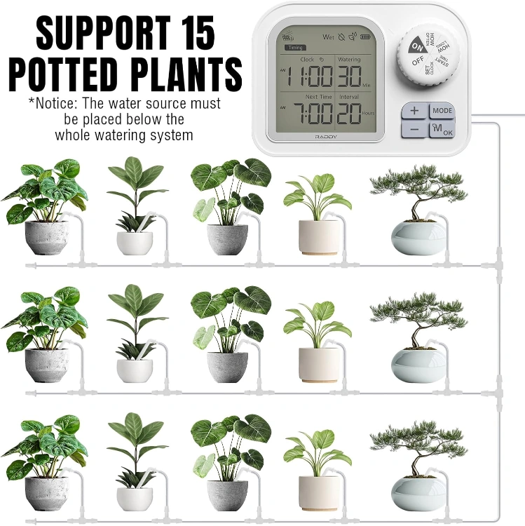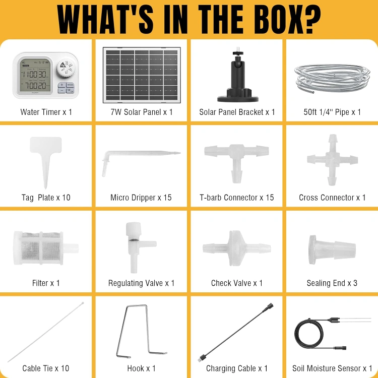 Solar Drip Irrigation Kit with IPX7 Waterproof, Auto Watering System for 15 Potted Plants, with Auto-Soil Humidity Detection, 2600mAh Battery, Large Display for Indoor Outdoor Balcony, Brand New in the Box/Sealed Features: Solar-Powered Automatic Watering: Features an adjustable solar panel and built-in 2600mAh battery that captures sunlight from all directions. Even on cloudy days, it stores enough power to support daily operation without frequent charging. For optimal performance, fully charge before first use Smart Soil Moisture Irrigation: With the soil moisture sensor, the system automatically waters when humidity drops below 64%, avoiding overwatering or underwatering. Saves up to 50% more water than traditional timer-based systems Powerful Pump for 15 Pots: Delivers a strong 4โ5m lift height, providing steady water flow for elevated or multi-level plants. Easily supports up to 15 potted plants at once, making it ideal for balcony gardens, vertical setups, and tiered arrangements IPX7 Waterproof Protection: The fully sealed circuit board prevents water intrusion and ensures long-term reliability, even in wet soil, heavy rain, or accidental hose sprays. Built to withstand harsh outdoor conditions without needing to be uninstalled during storms Easy Setup: Just connect the tubes, set your schedule, and youโre done. The clear display shows real-time status and battery alerts, making it Perfect for busy professionals, travelers, seniors, and plant lovers who prefer effortless maintenance