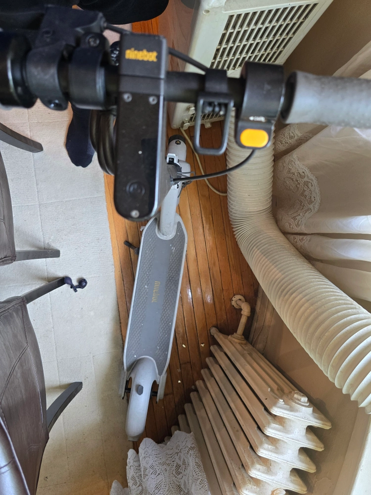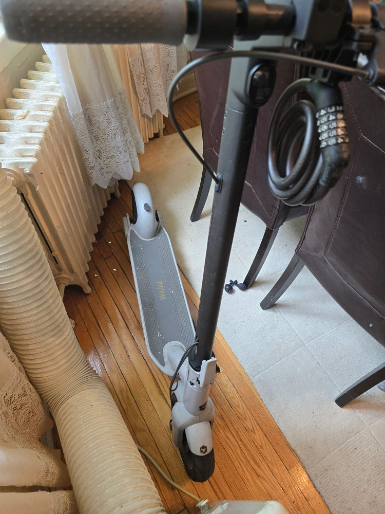 A personal electric scooter. Features a platform for standing. Has handlebars for steering and controlling speed. Equipped with a combination lock. This would be great for peaceful weekend rides. ninebot scooter back tire is flat but good condition