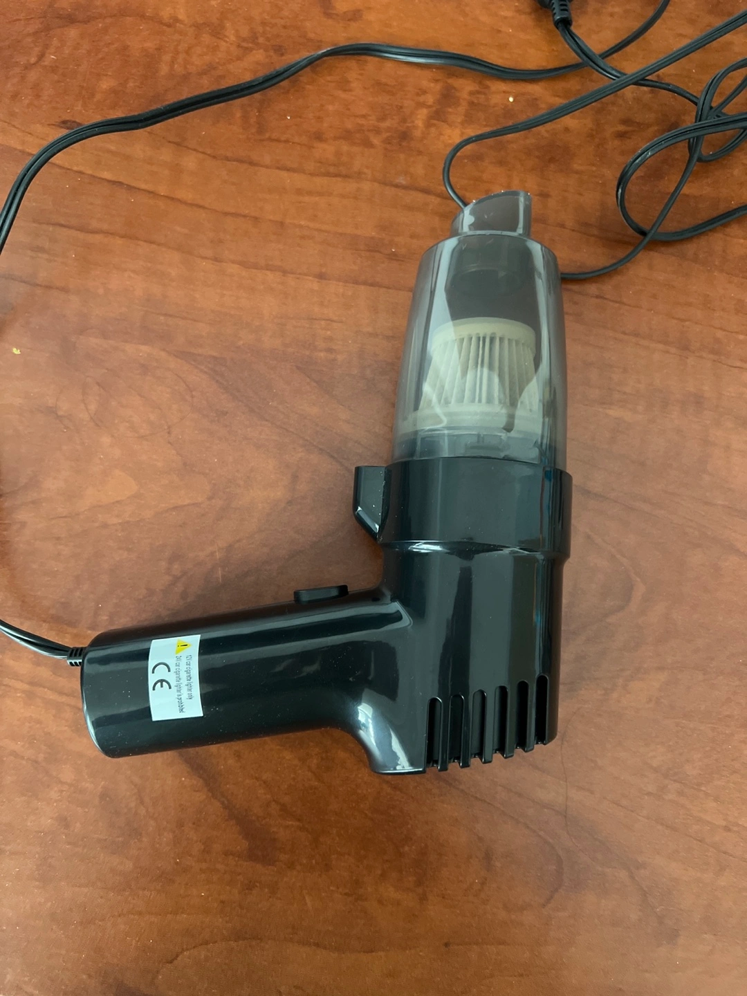 A small vacuum with a long cord, that can be plugged into a car. Featuring a power button and a transparent dustbin. Taking a few moments to tidy up your car interior can be a therapeutic experience.