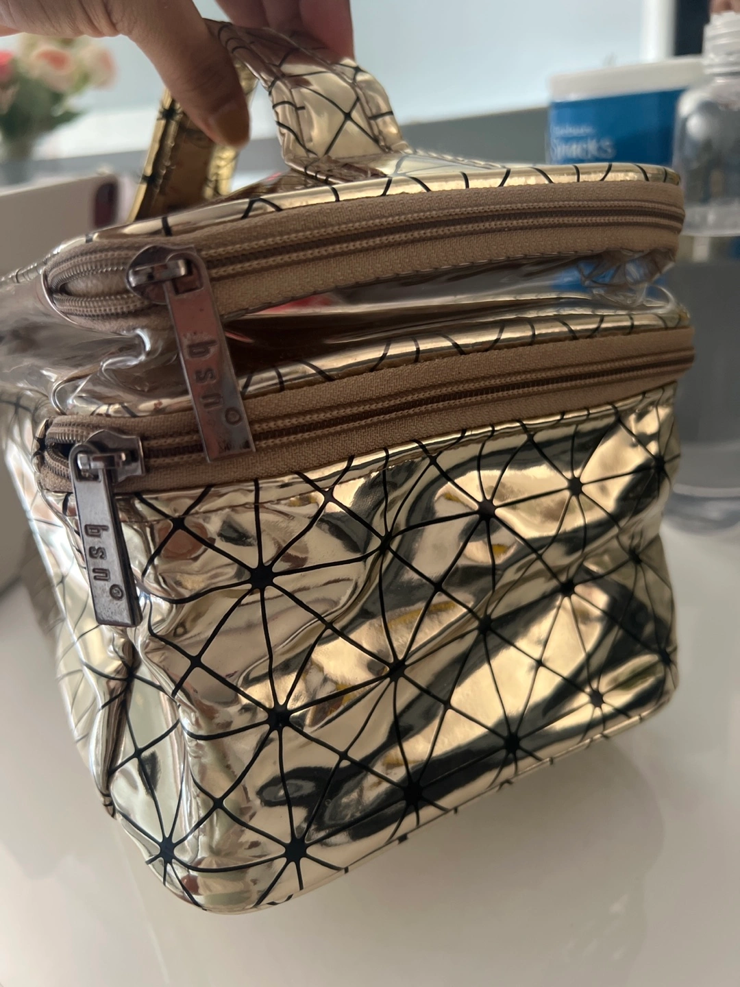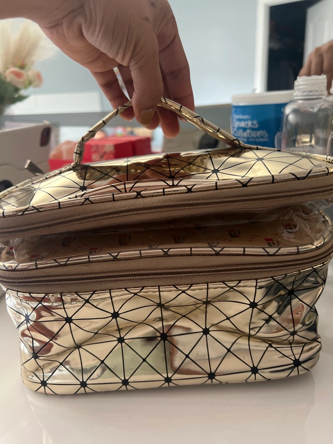The bag is gold with black geometric patterns, with a transparent section on top. It includes a top handle, zippers, and a brand tag. This bag is an excellent option for organizing your essentials in a stylish way.