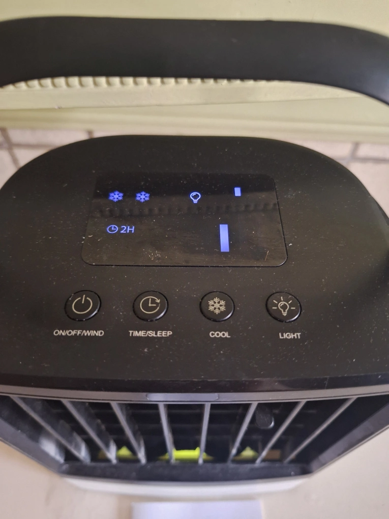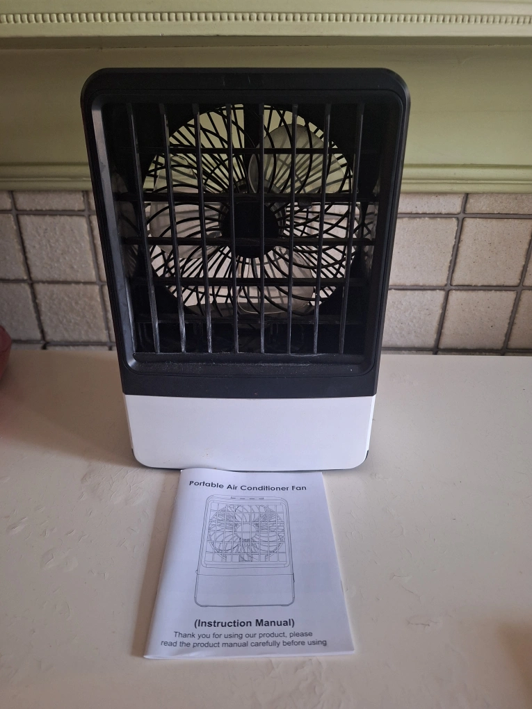 Portable Air Conditioner Fan & Humidifier. Digital display with 3 speed. Add water at the bottom to create cooling mist. 24 hours timer. Instruction manual included. 1kg weight 170 x 114.5 x 250mm Cordless design with rechargeable battery. Charge with a C cable