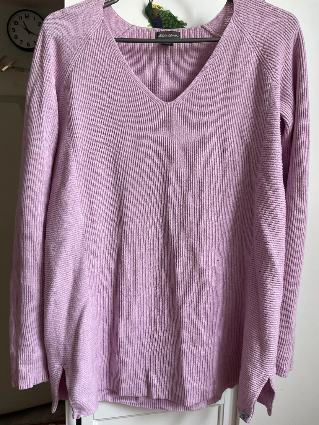 Lavender coloured sweater. Features a V-neck. Ribbed texture. Long sleeves. Side slits. An excellent item for staying cozy in the house on a Sunday morning.