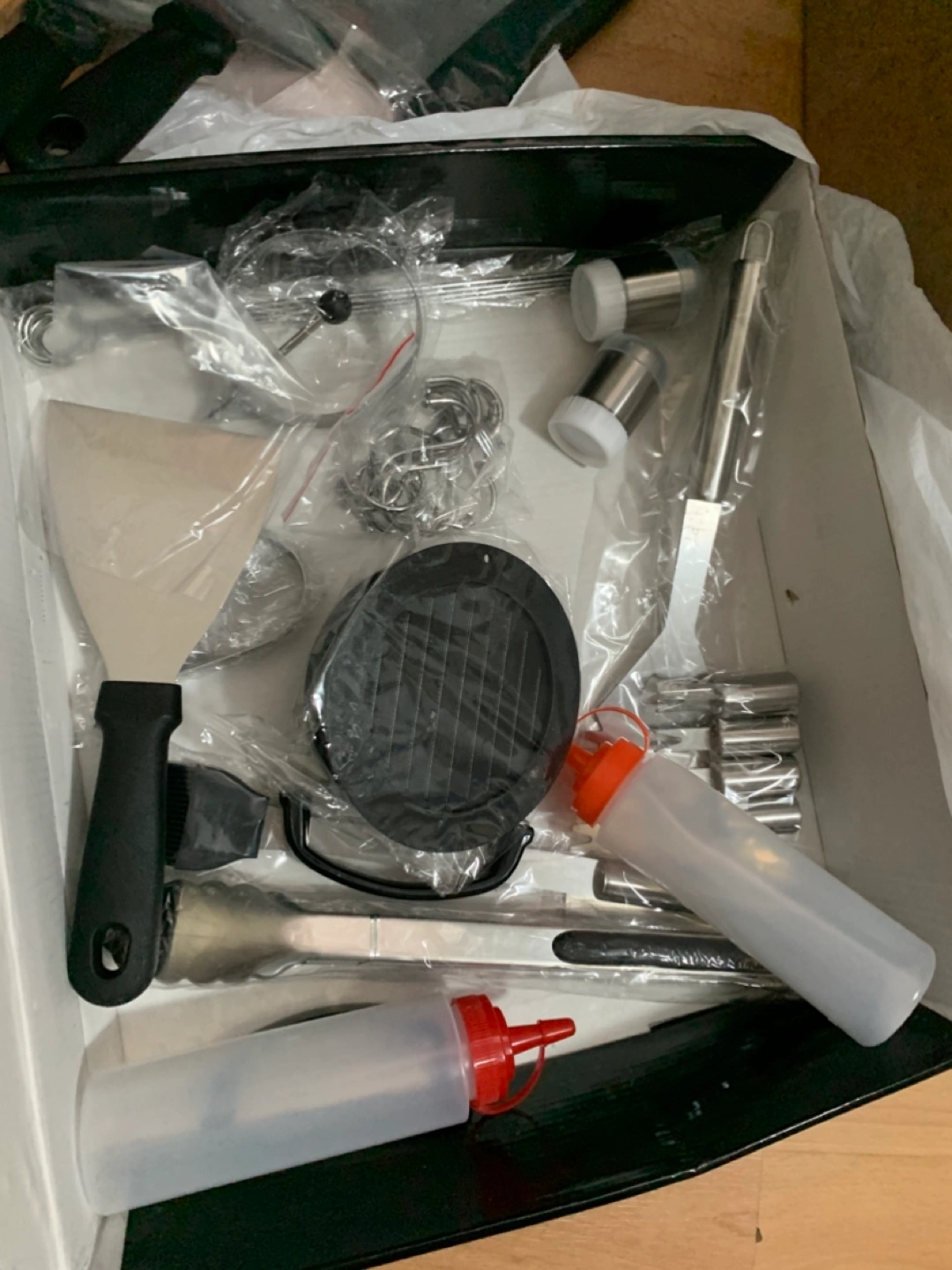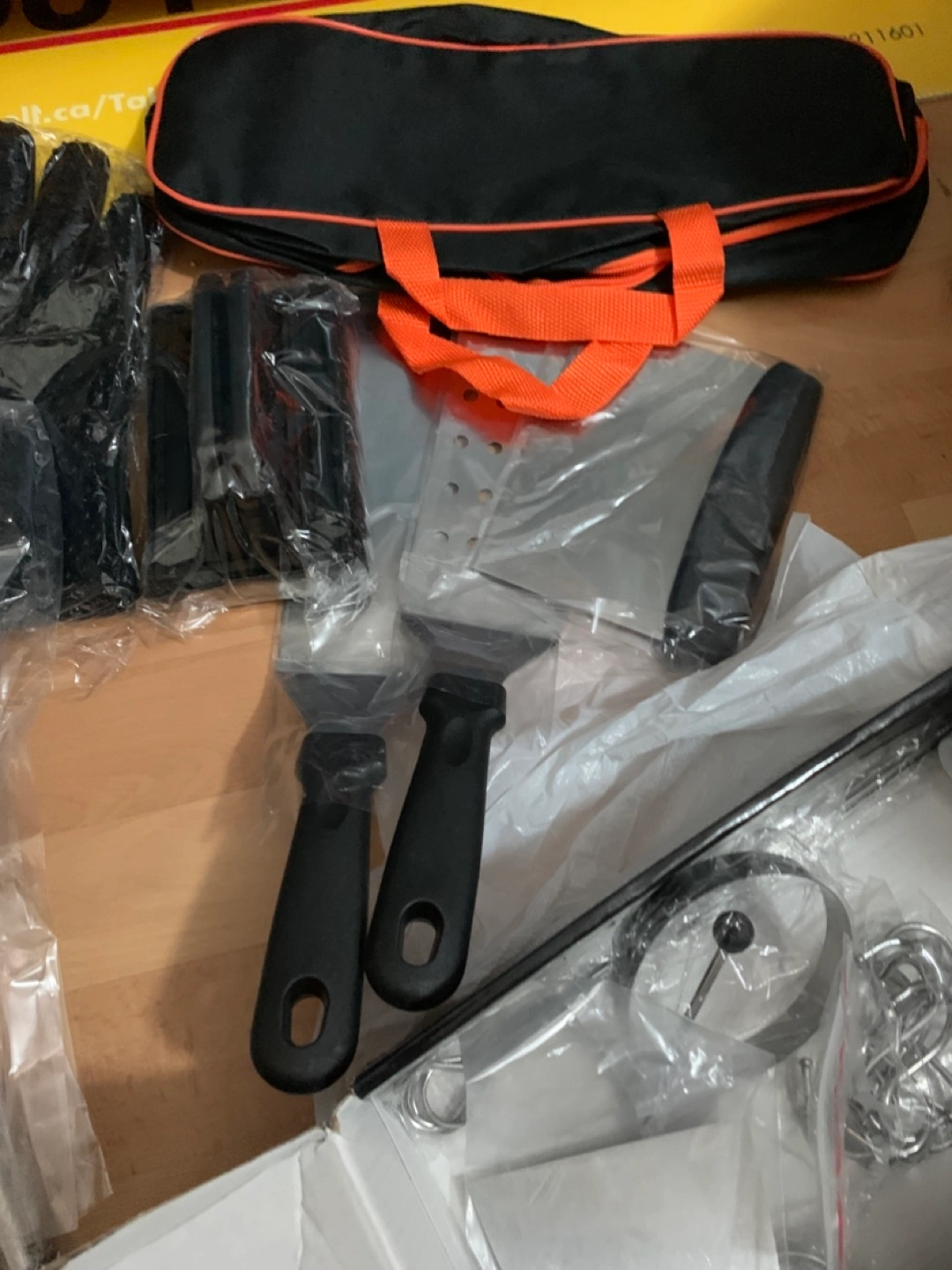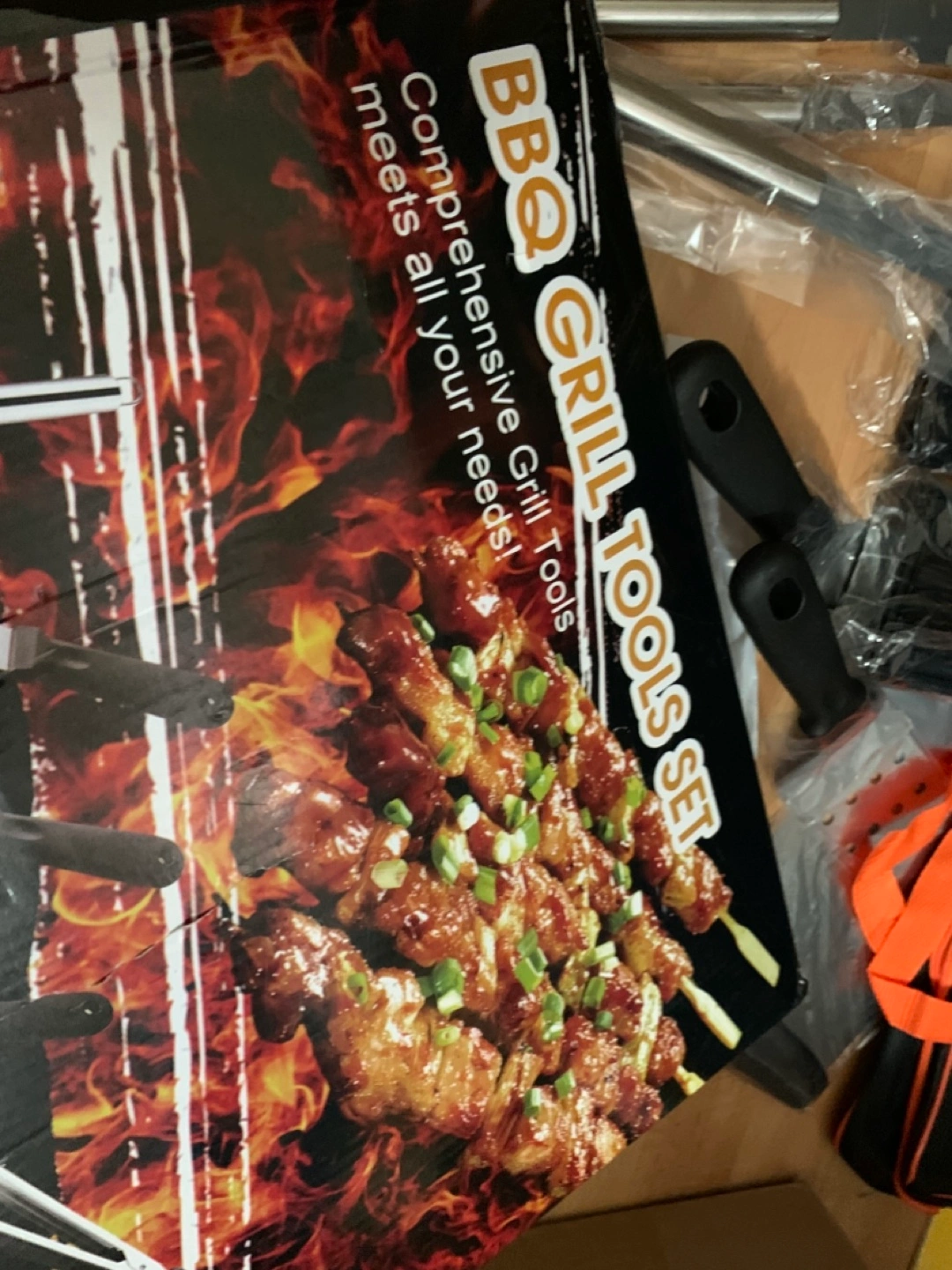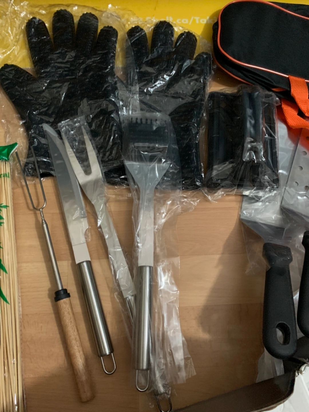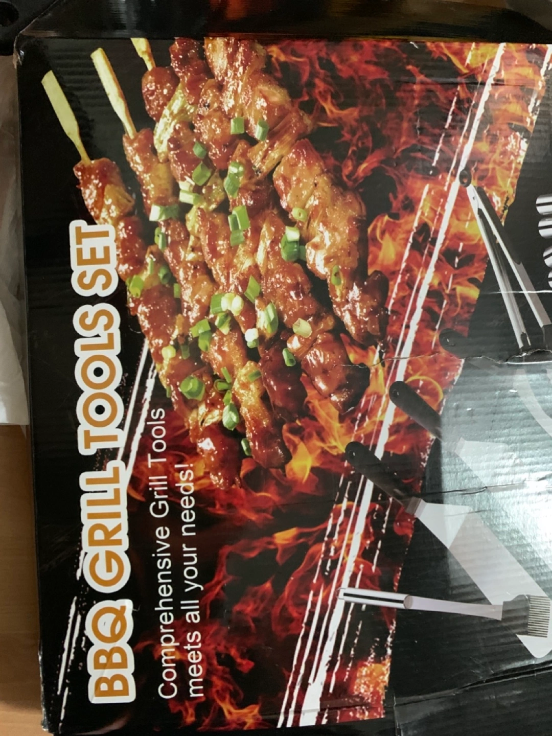 A comprehensive grill tools set. Includes tongs, a spatula, and utensils. Will also have bamboo skewers, all for easy grilling. This would be wonderful to use for your next backyard BBQ, just relax and enjoy the company and the food.