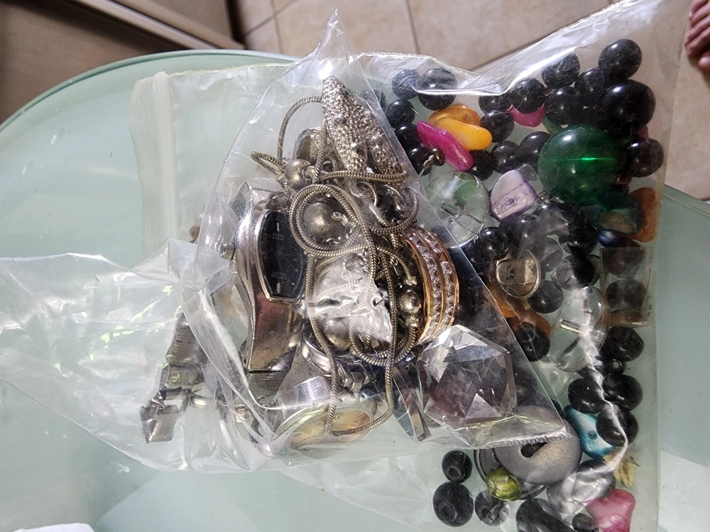 A variety of jewelry in a bag. Contains necklaces, rings, and watches (Citizen watch) . Also includes a selection of beads. This collection would be perfect for anyone looking to explore their creative side through jewelry making.
