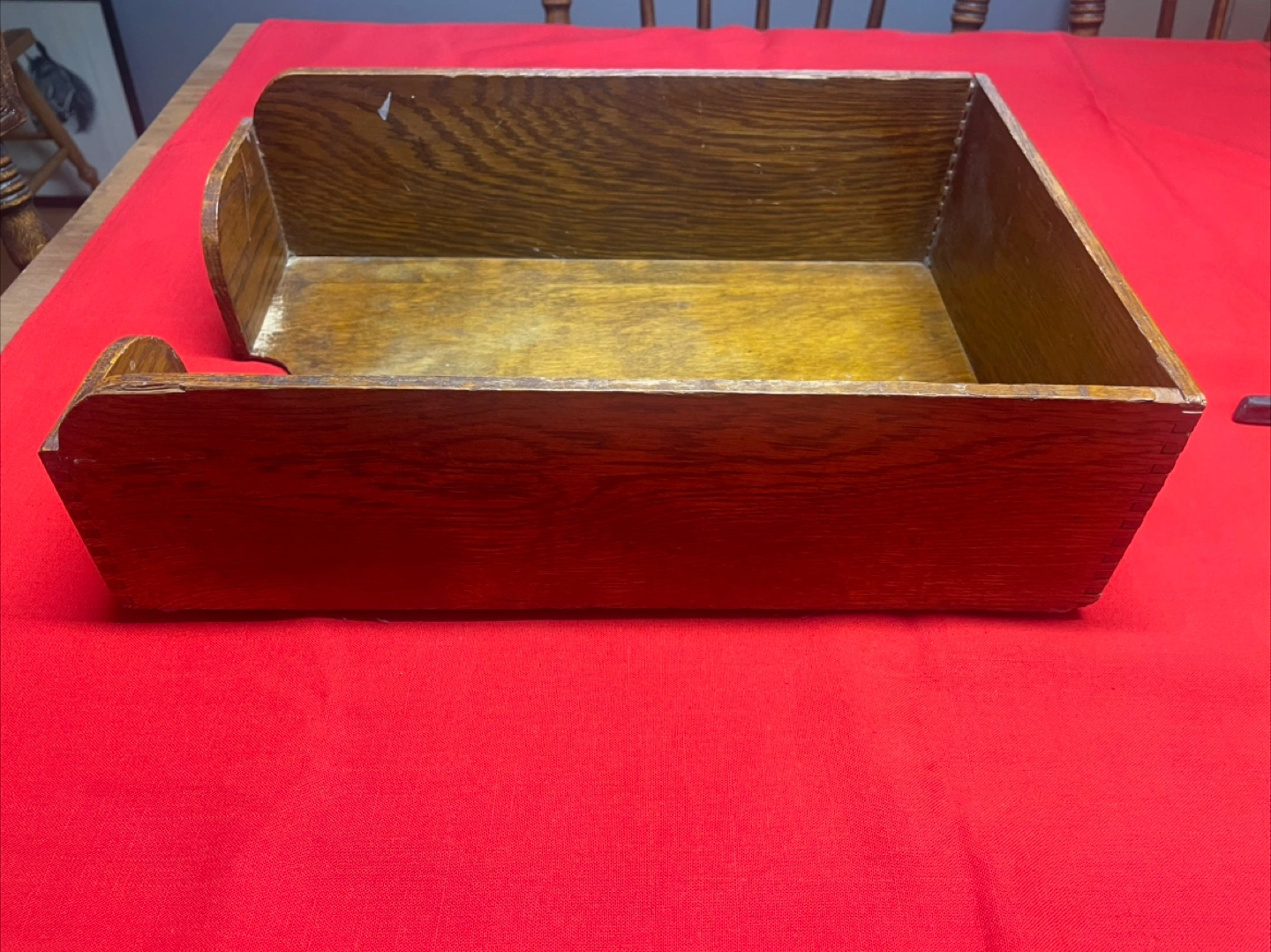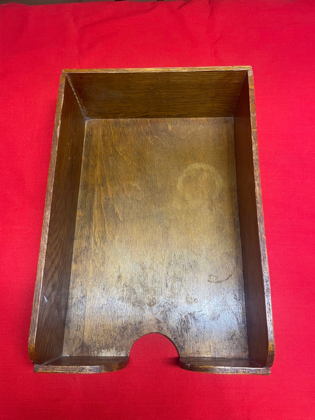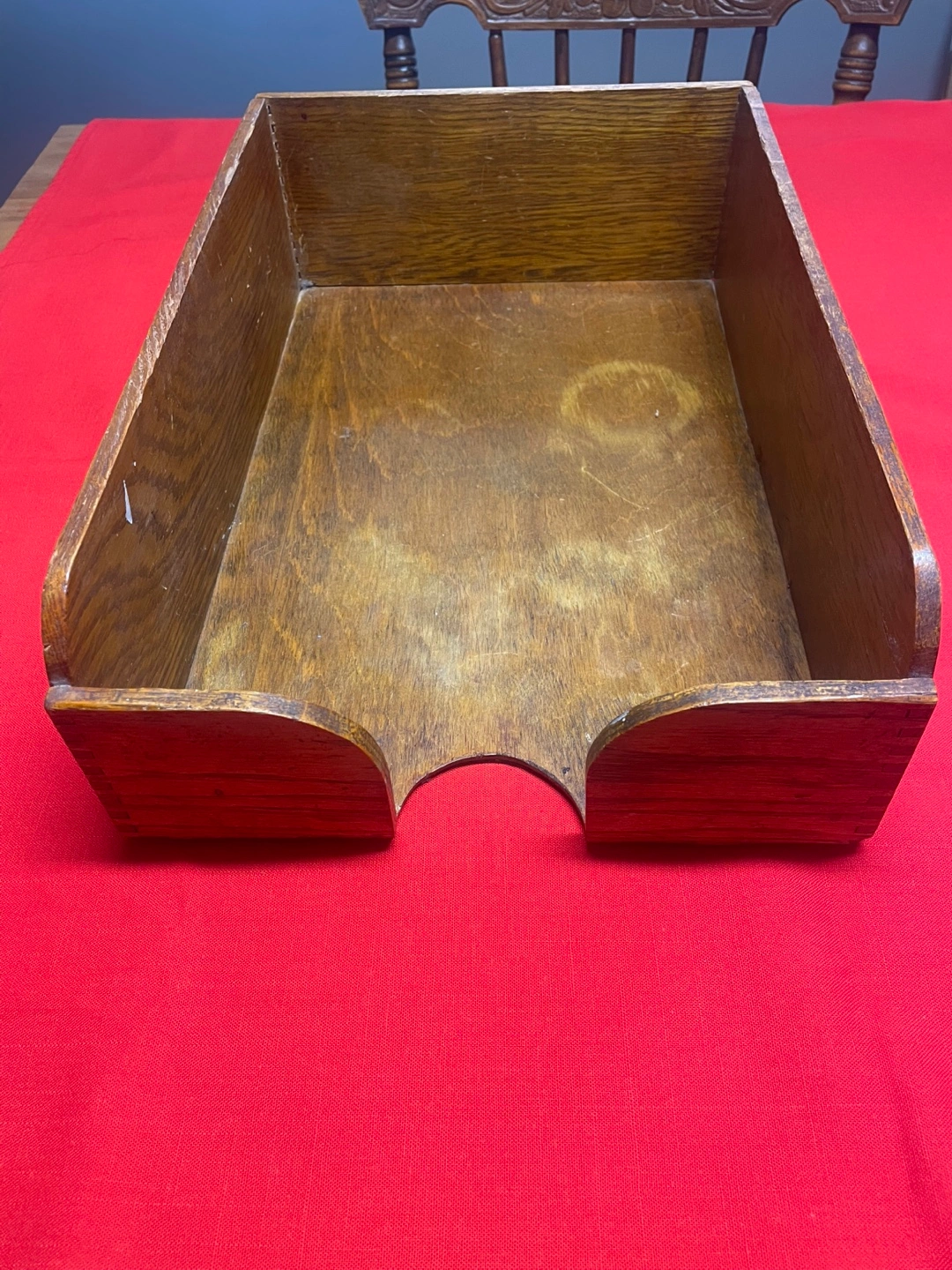 This is an antique oak office paper tray, perfect for adding a touch of vintage charm to your desk! It's in good condition for its age, with a lovely patina that only time can create. Ideal for organizing your documents in style. 15 3/4” L X 10 1/2” W X 4 3/4” H * Material: Solid Oak * Style: Antique * Features: Front cut-out for easy paper access This tray has seen its share of paperwork, just imagine the stories it could tell if it could talk! Don't miss your chance to own a piece of history. If you're seeing this ad, yes, it's still available!