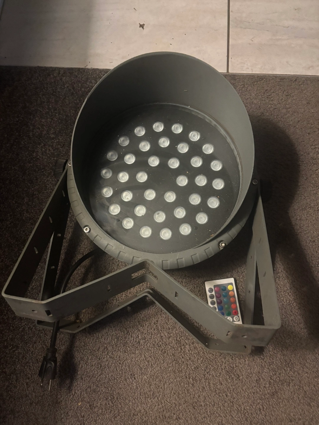 Outdoor RGB flood light. Remote control included. Operates on 110V-265V. 60° beam angle. Grey colour.