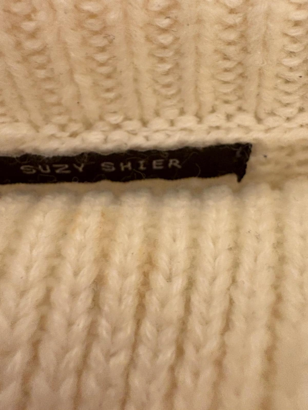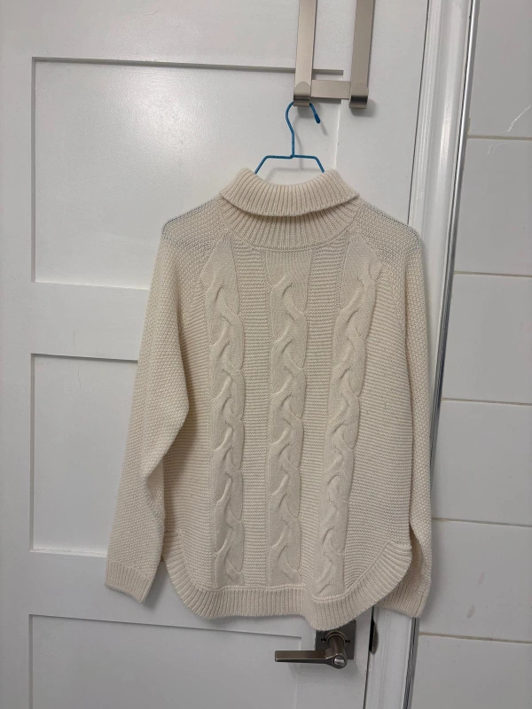 Cream coloured Suzy Shier sweater. Features cable knit details down the front and a turtleneck design.
