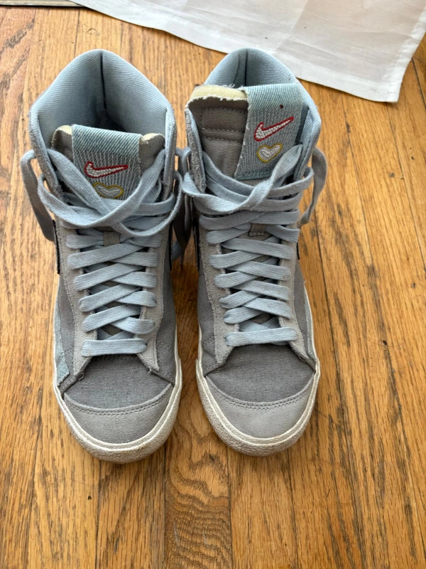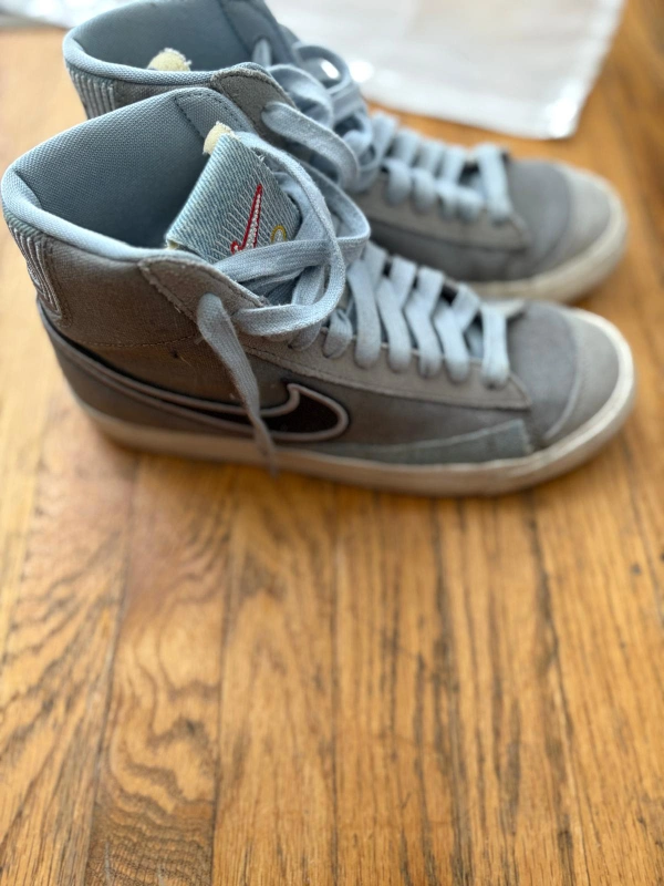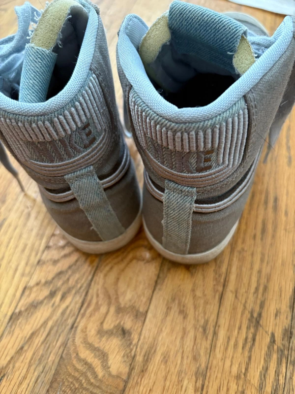 A pair of high-top sneakers in a soft gray colour. Features a lace-up design, with a swoosh logo on the side.