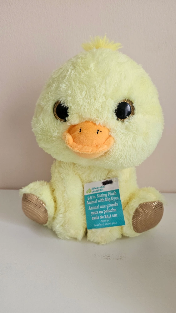 Yellow duck plush with big eyes. Its sitting position offers a comforting sense of calm. Cute plush with gold accents on the feet.