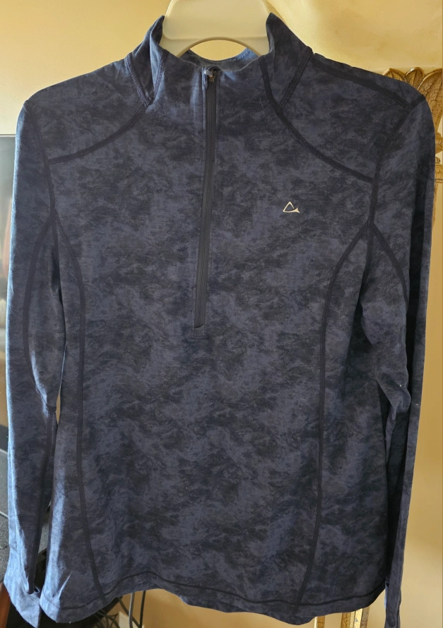 A nice navy long sleeve shirt with a quarter-zip. Featuring thumb holes, and a neat patterned design. Such a cozy piece to wear when you want to feel at ease.