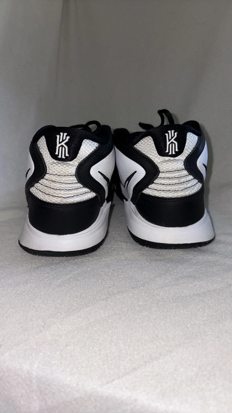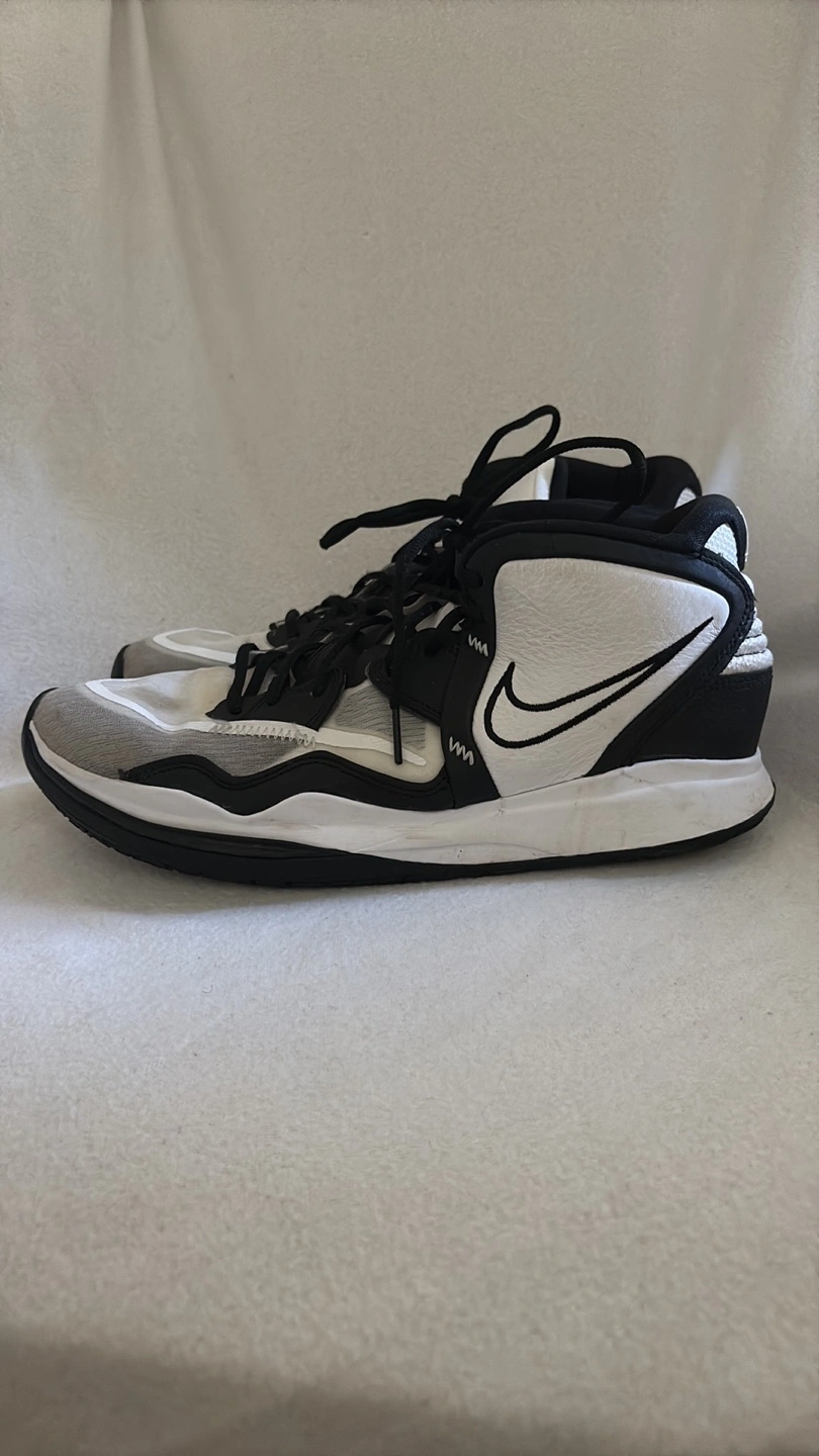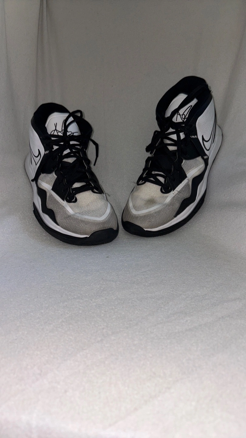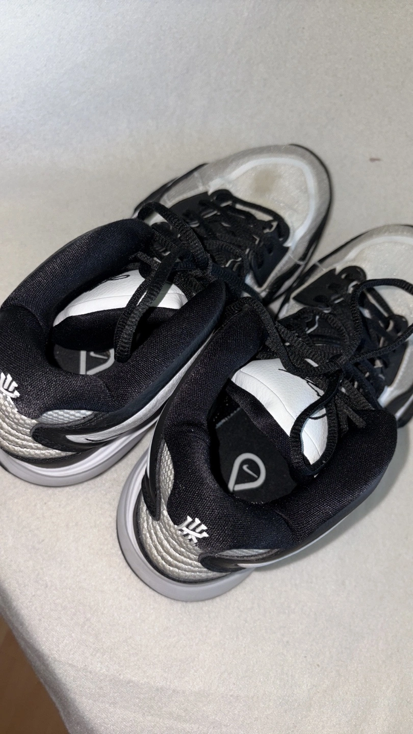 Sneakers in black, white, and grey. Featuring the Nike swoosh logo. The tongue appears to be padded. The back of the shoes have a Kyrie logo. Consider taking these on your next sports outing, they will do great.