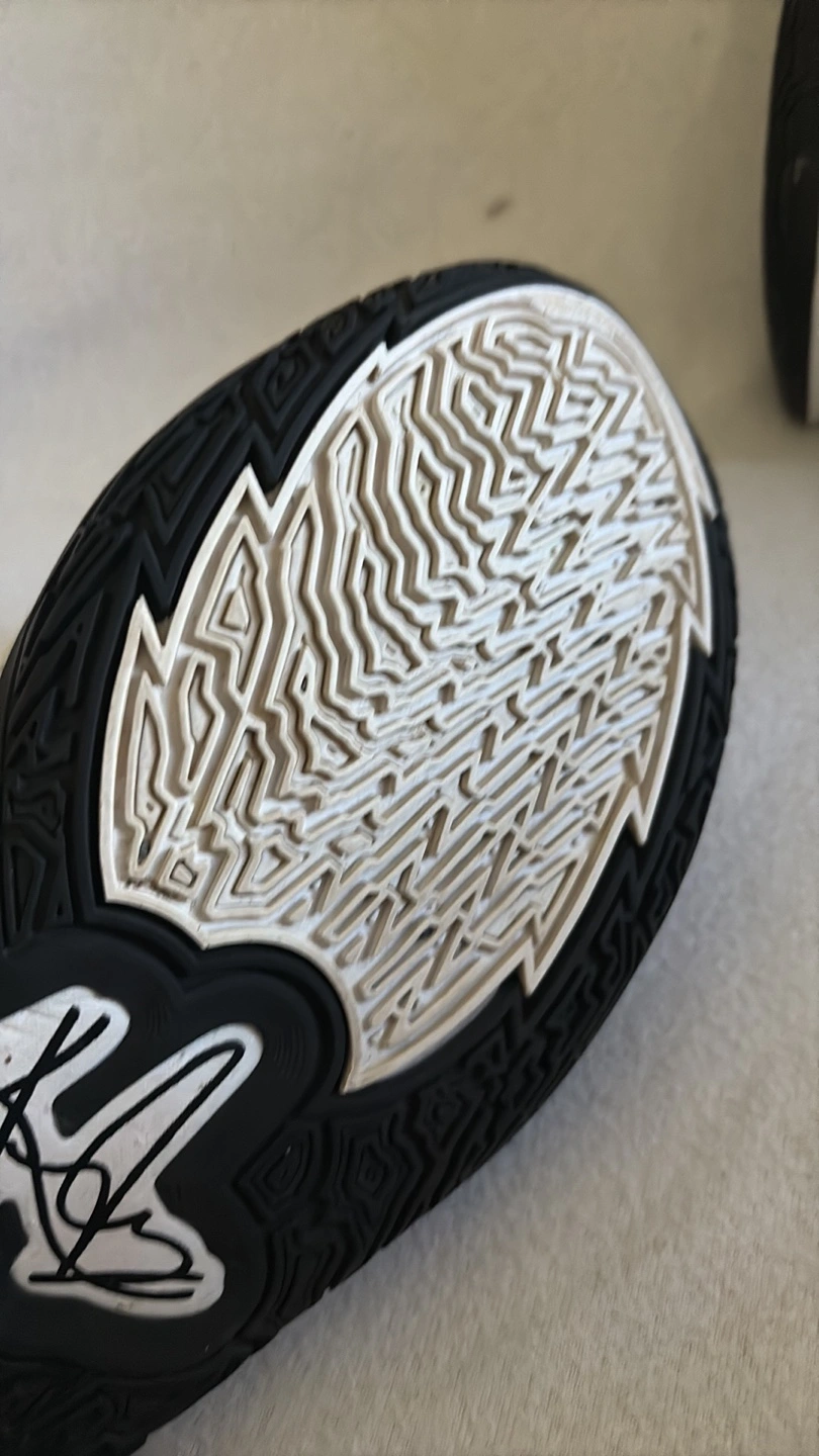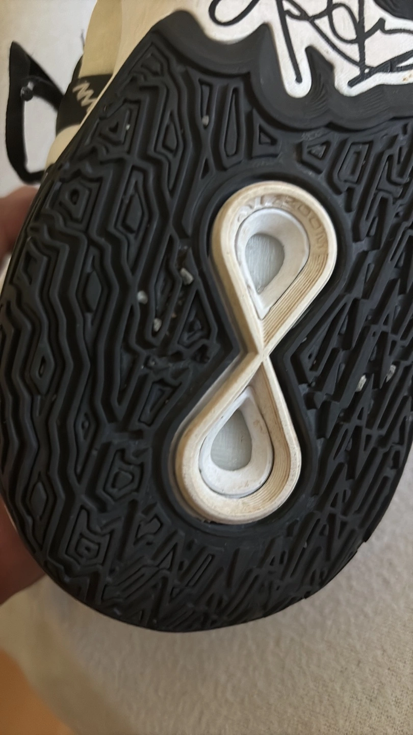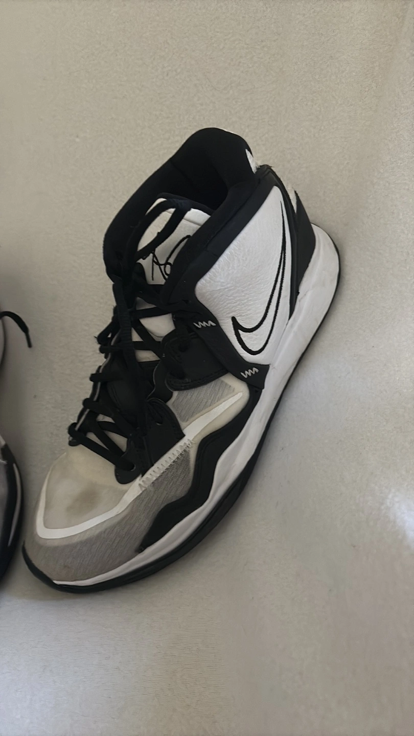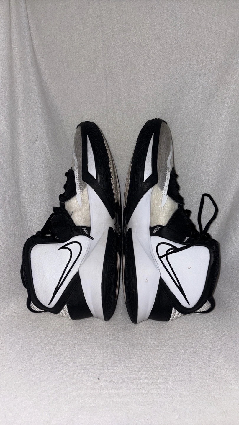 Sneakers in black, white, and grey. Featuring the Nike swoosh logo. The tongue appears to be padded. The back of the shoes have a Kyrie logo. Consider taking these on your next sports outing, they will do great.