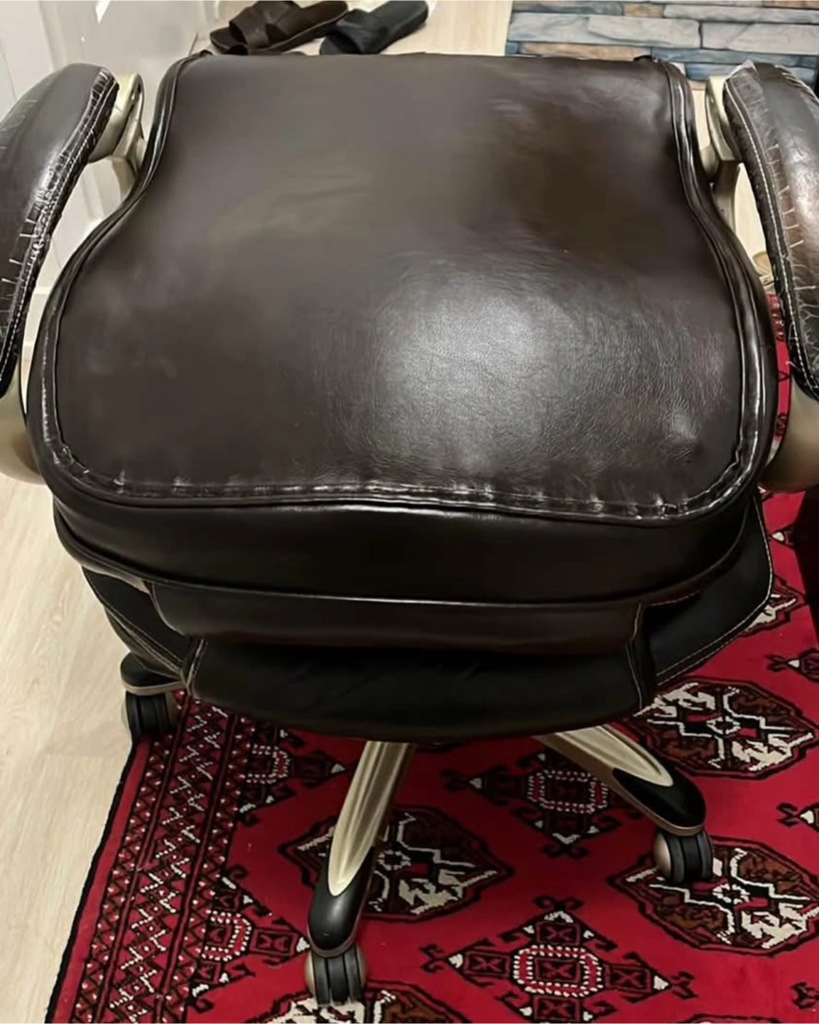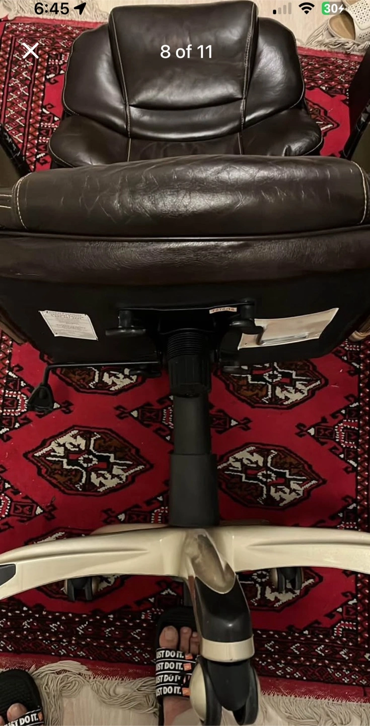 Features an office chair with a leather exterior. It also includes a base with wheels and armrests. This chair is perfect for your home office, providing a comfortable place to unwind at the end of a long day.