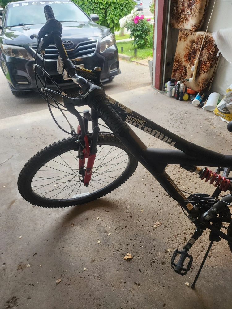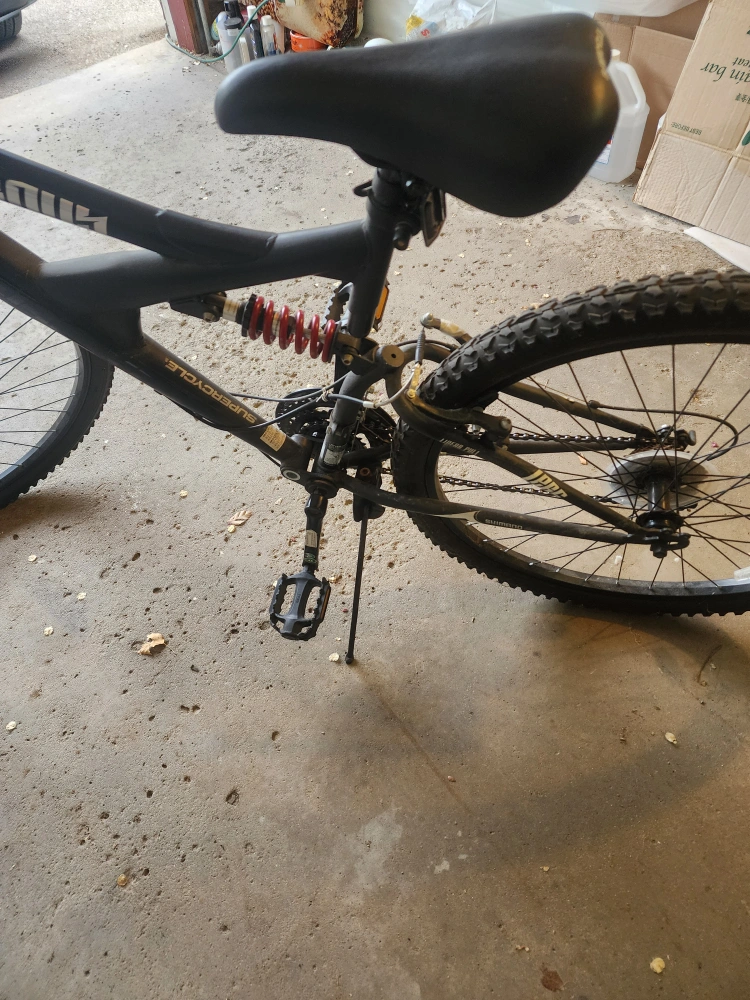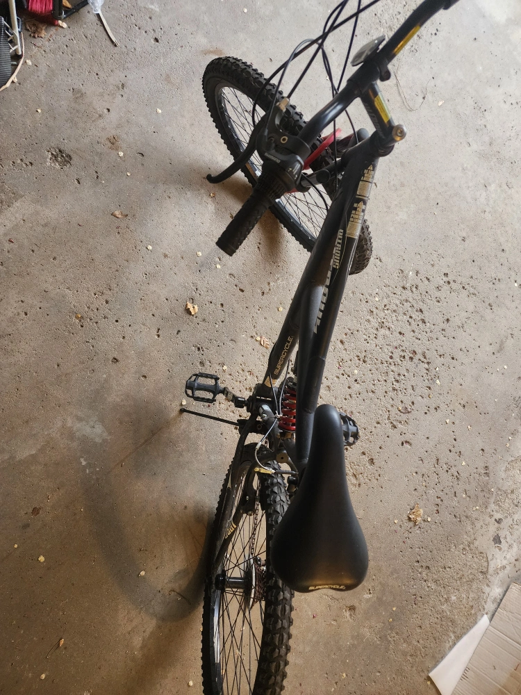 Black mountain bike, with suspension. The tires are knobby. 12 inch diameter wheels. The seat is black, and the pedals are included. This bike is perfect for outdoor adventures and enjoying the scenery in peace.