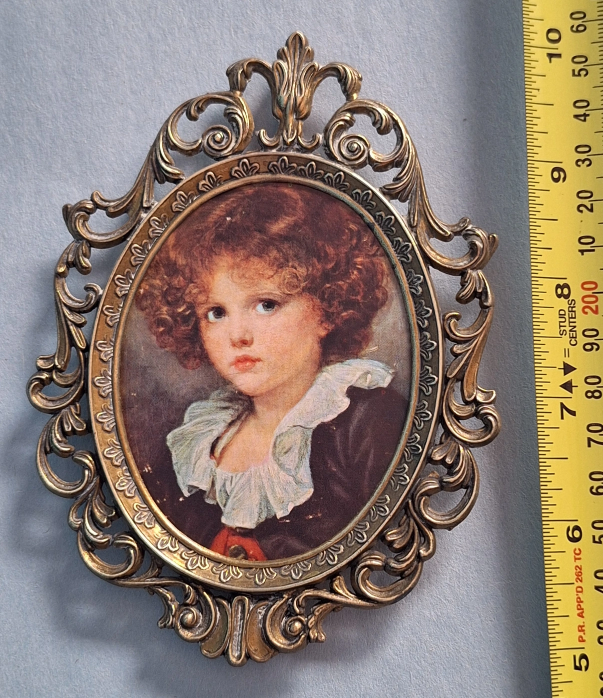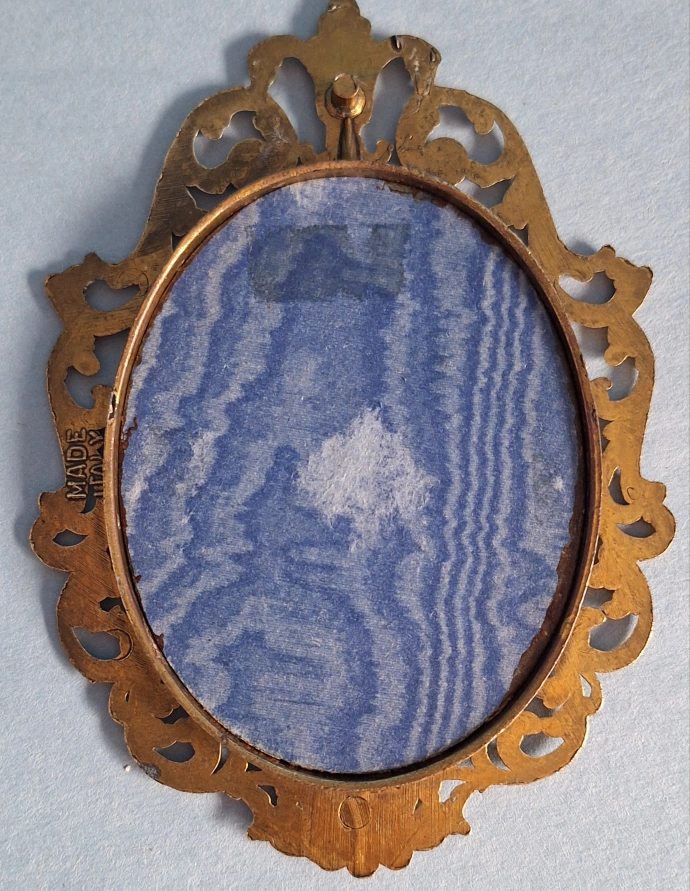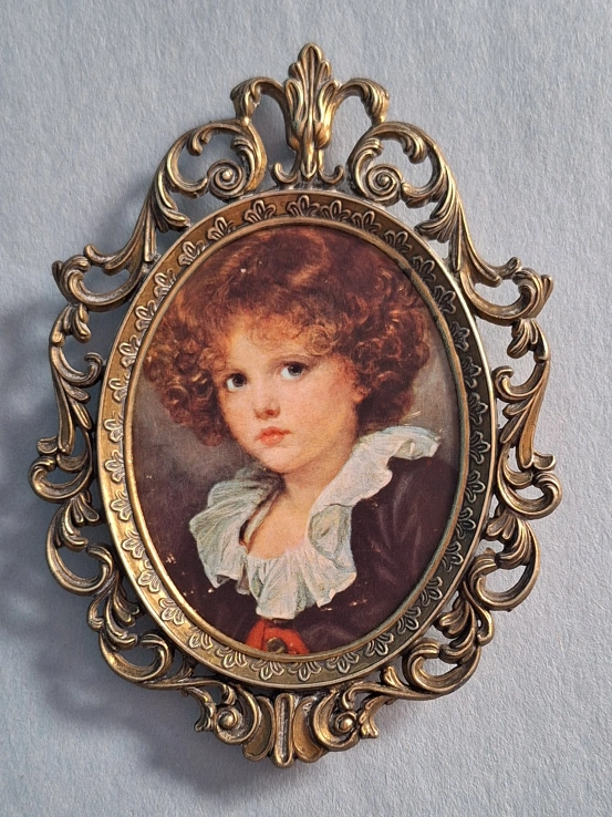 A gorgeous vintage brass picture frame with a Jean-Baptiste Greuze fine art print inside. Oval shape with an ornate filigree design.