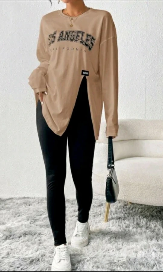 Long-sleeved top in a neutral tone, featuring a split front design. Leggings in a classic black. 2pcs/Set Women's Loose Knit Letter Print Long Sleeve Split Hem T-Shirt & Skinny Leggings Suit