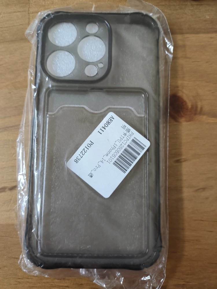 A clear phone case. It has a camera opening and a card holder slot. The case is still in its original packaging, ready to find its new owner who will definitely enjoy having a new phone case.