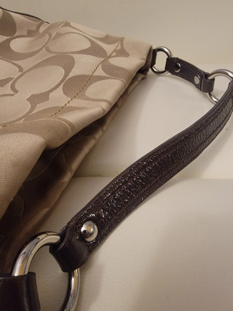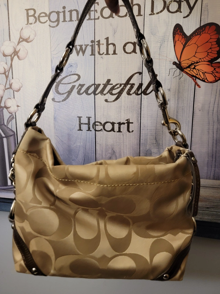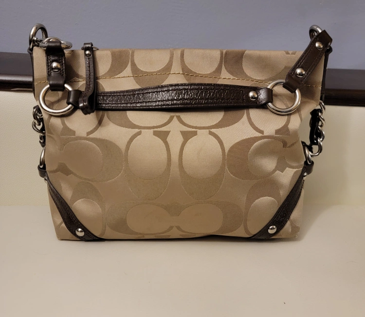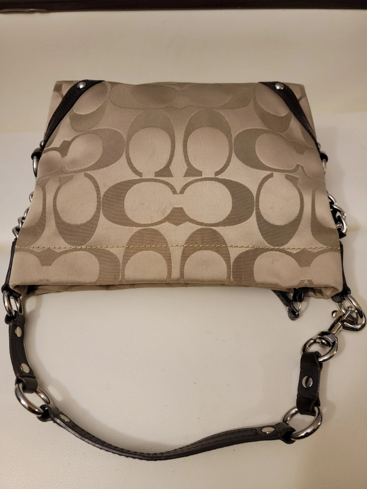 Lovely shoulder bag. Features a printed pattern. Includes leather trim. It would be a wonderful addition to your wardrobe, and a perfect item to hold your belongings.