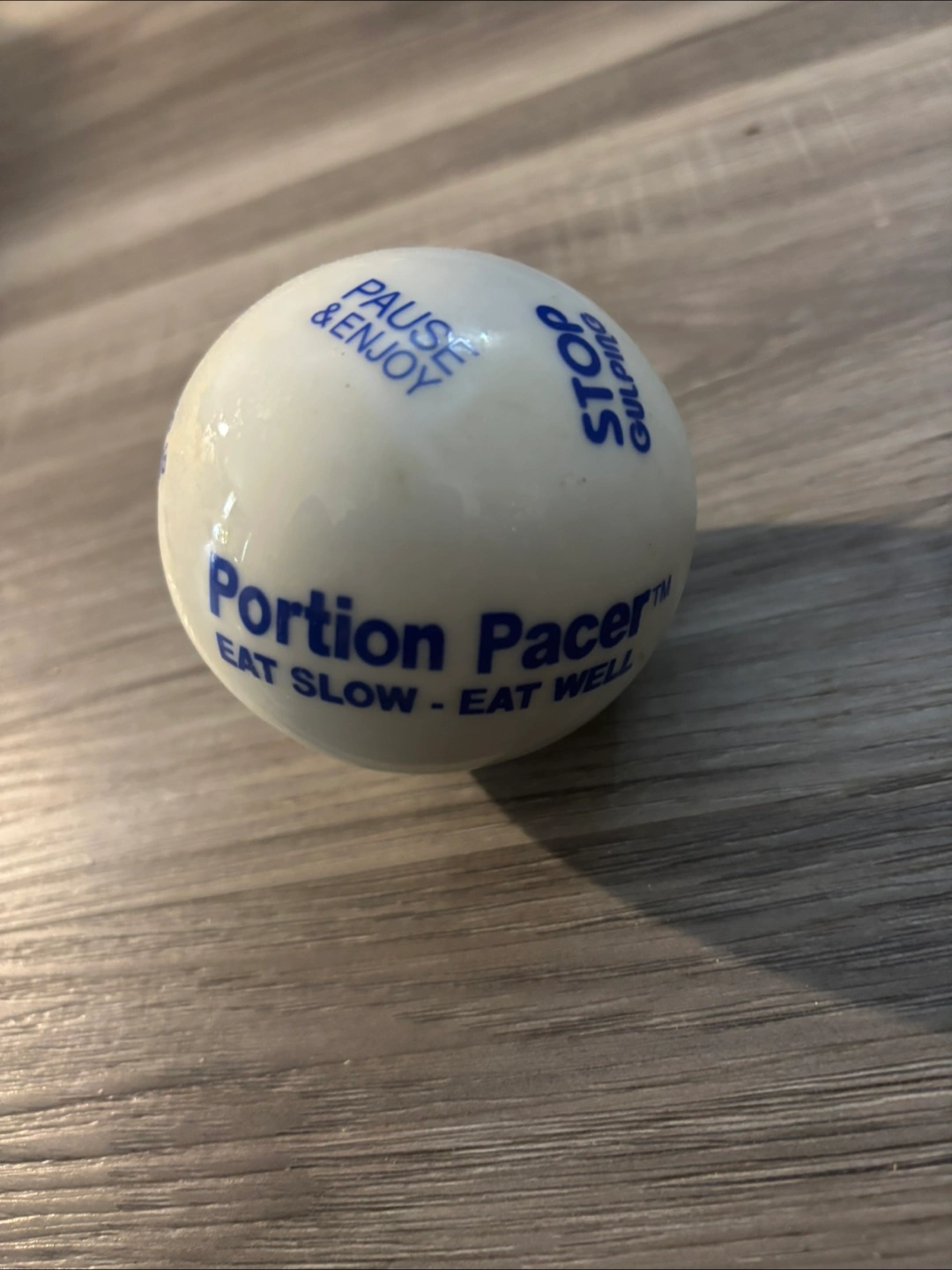 •Pet device specially designed to control how fast your dog eats •Helps prevent gulping, choking, and vomiting •Works in any bowl and with any breed of dogs •Safe for dishwashers The item is a white ball with writing on it. In blue writing, it says "Pause & Enjoy", "Stop Gulping", and "Eat Slow - Eat Well". This ball is perfect for a mindful eating experience.