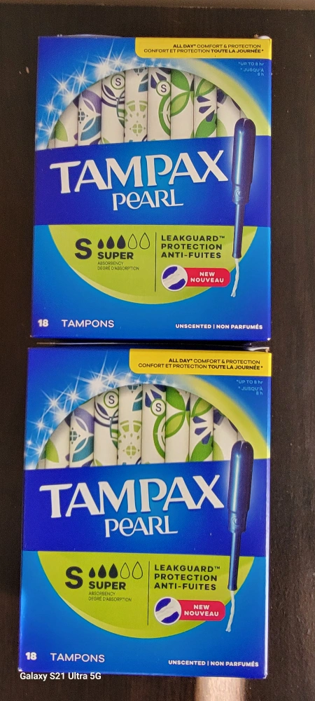 Two boxes of tampons. Each box has 18 unscented tampons with a super absorbency. These are easy to pack in your purse for everyday use, and are an essential item for a smooth day.