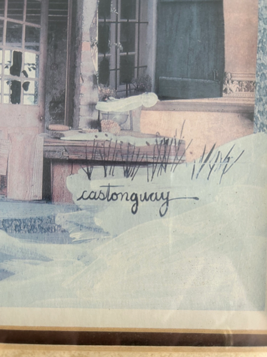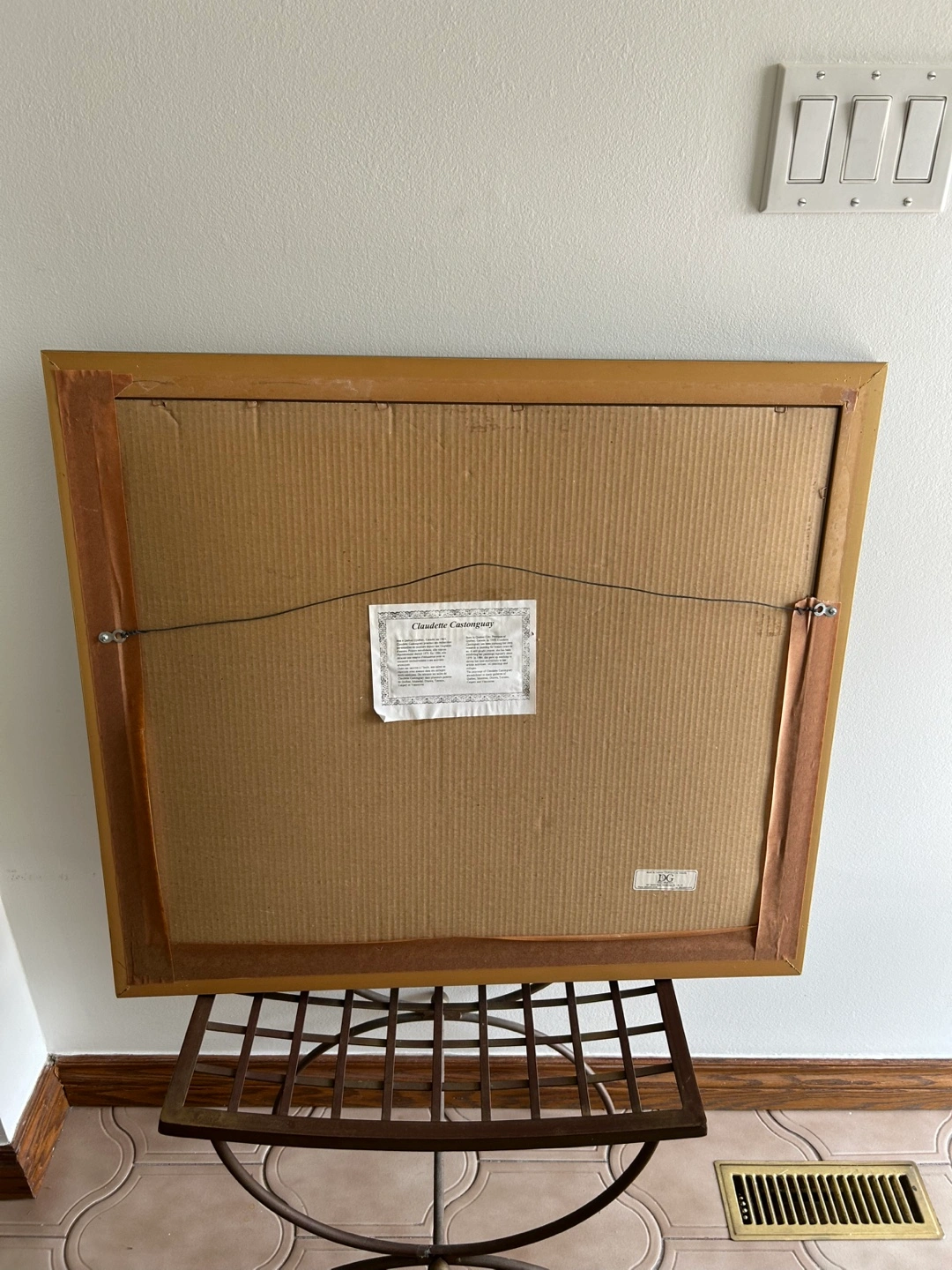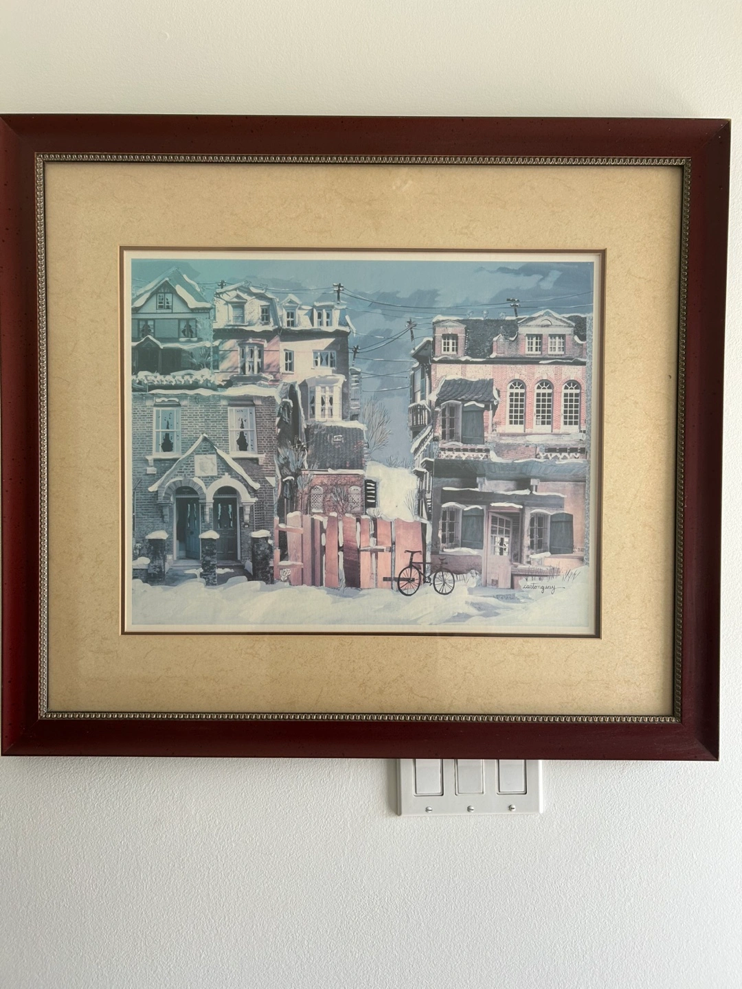 Original Framed artwork with a winter street scene. Features buildings, a bicycle and snow. A warm addition to any room to help you relax after a long day.