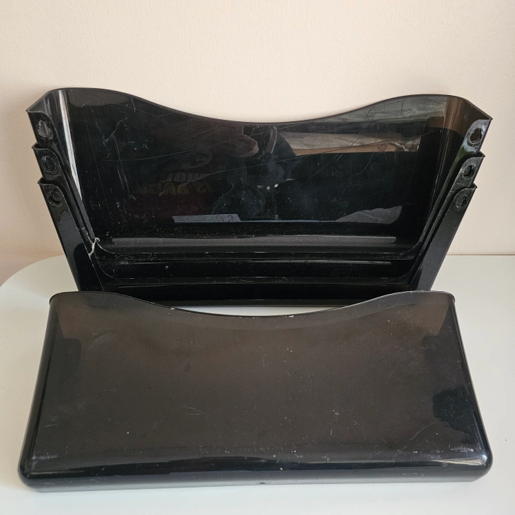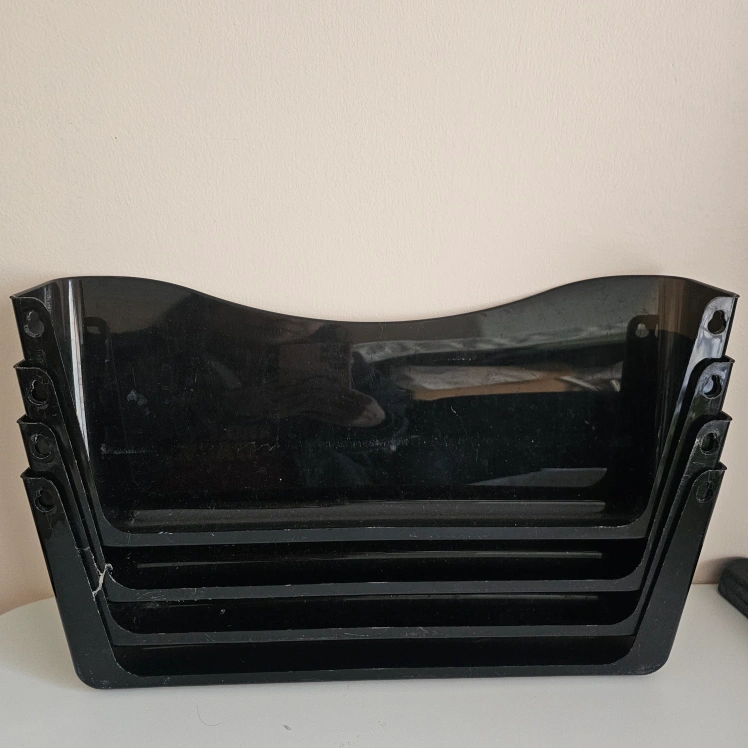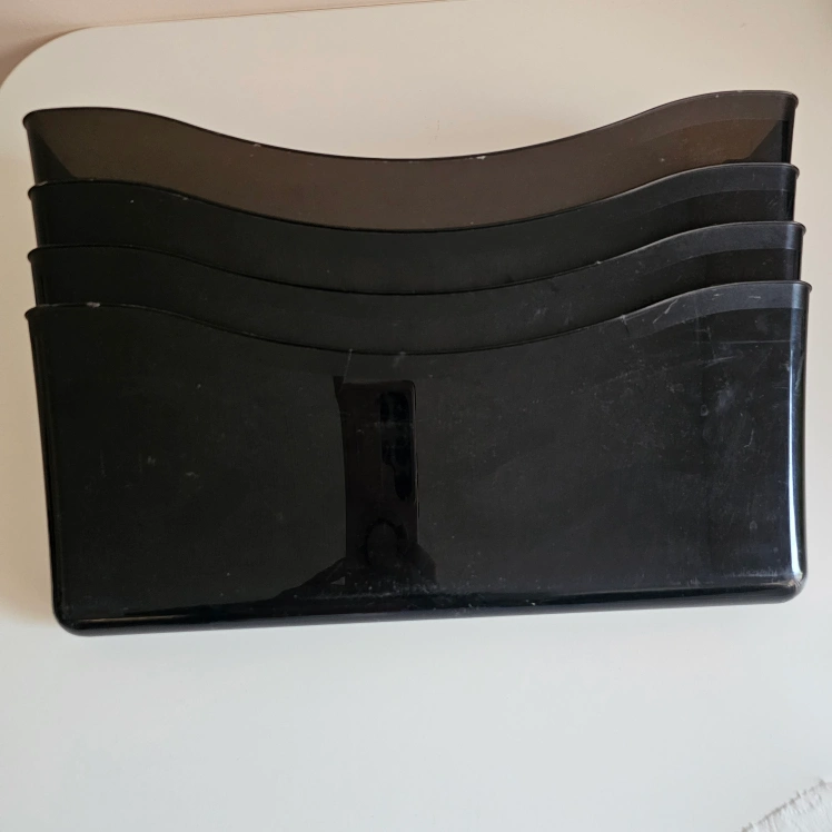 A stack of file organizers. They are black. The top edges are wave-shaped. They can be used to make your space more organized and your life more peaceful. $5 for set of 4. tissue for reference