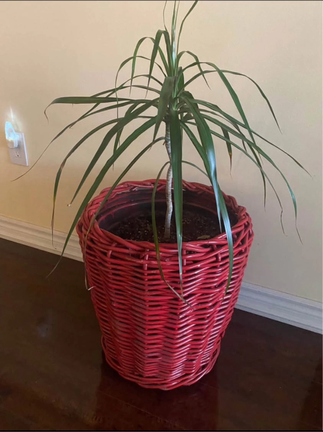 The pot has a lovely wicker design and is painted in a vibrant red. The plant is a tall houseplant with long green leaves. Adding this item to your home will bring a sense of peace to your space.
