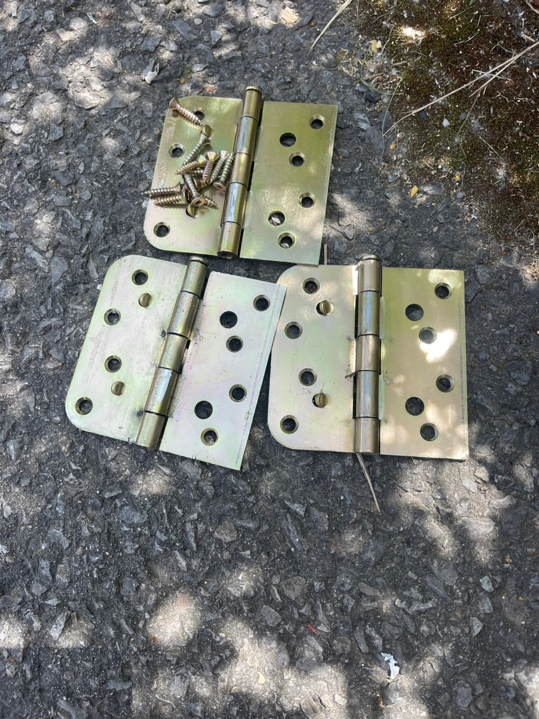 Three door hinges with screws. Made of metal. May need a good cleaning. These door hinges can create a sense of calm in the home, knowing all your doors are secure.