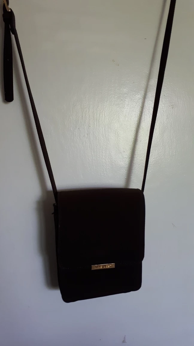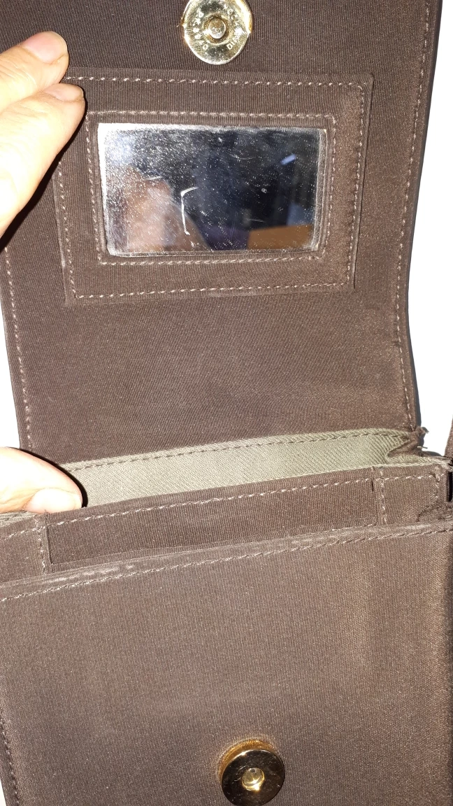 A compact crossbody bag in brown. The bag's interior reveals a mirror and multiple compartments. It also features a long, adjustable strap, perfect for keeping all your essentials close.