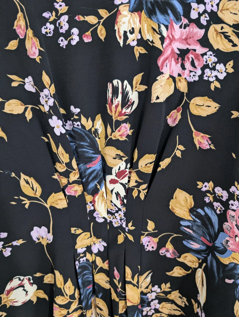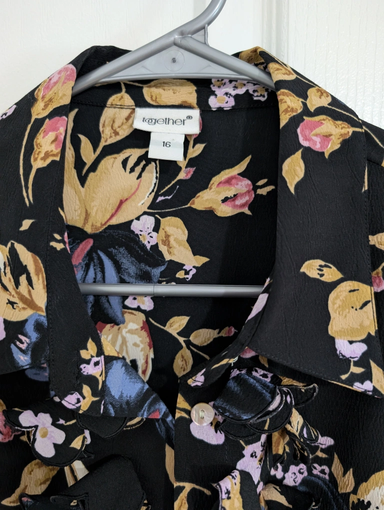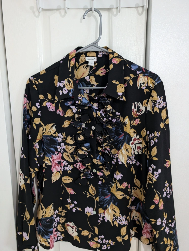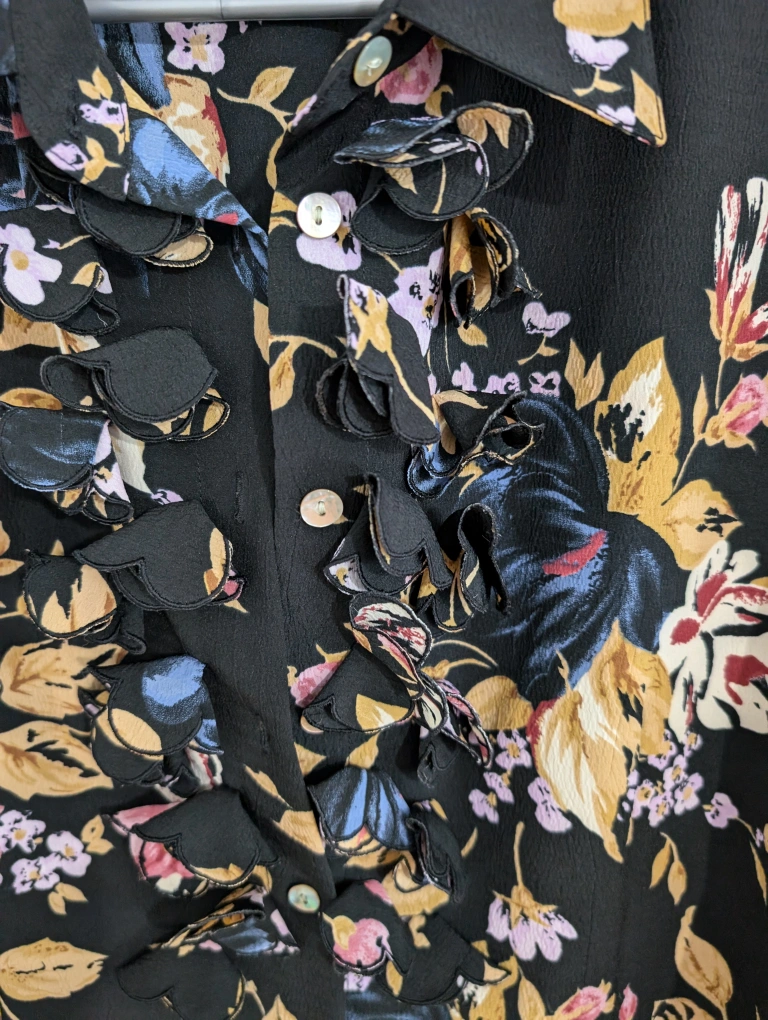 Gorgeous black blouse featuring a floral pattern and a ruffle down the front. Buttons down the front.