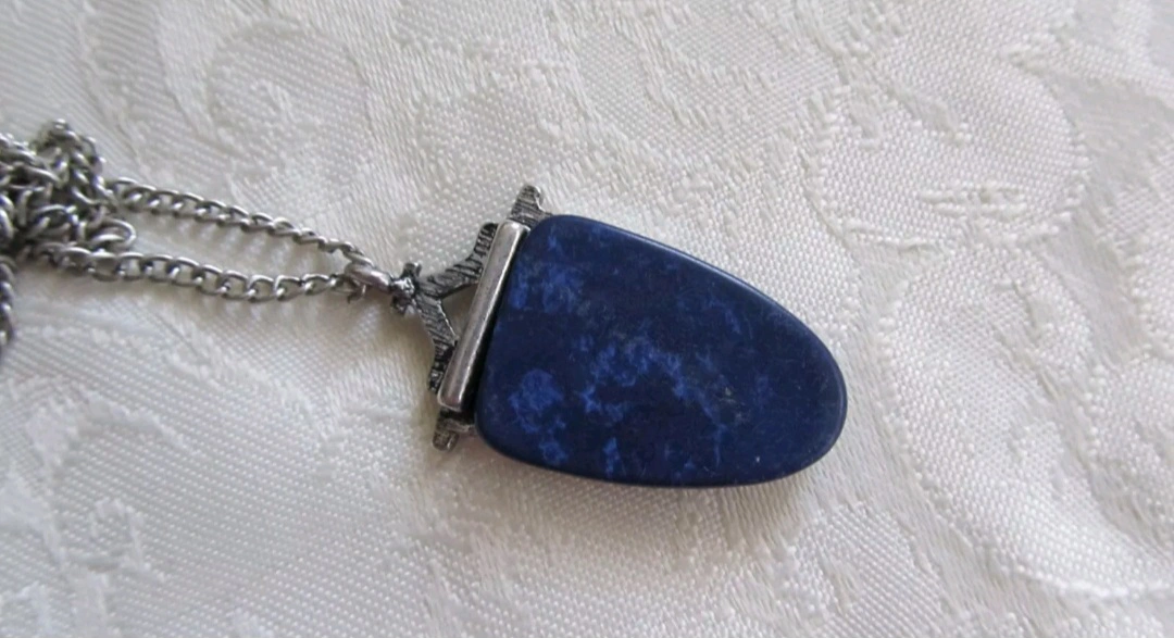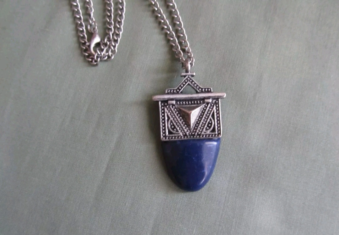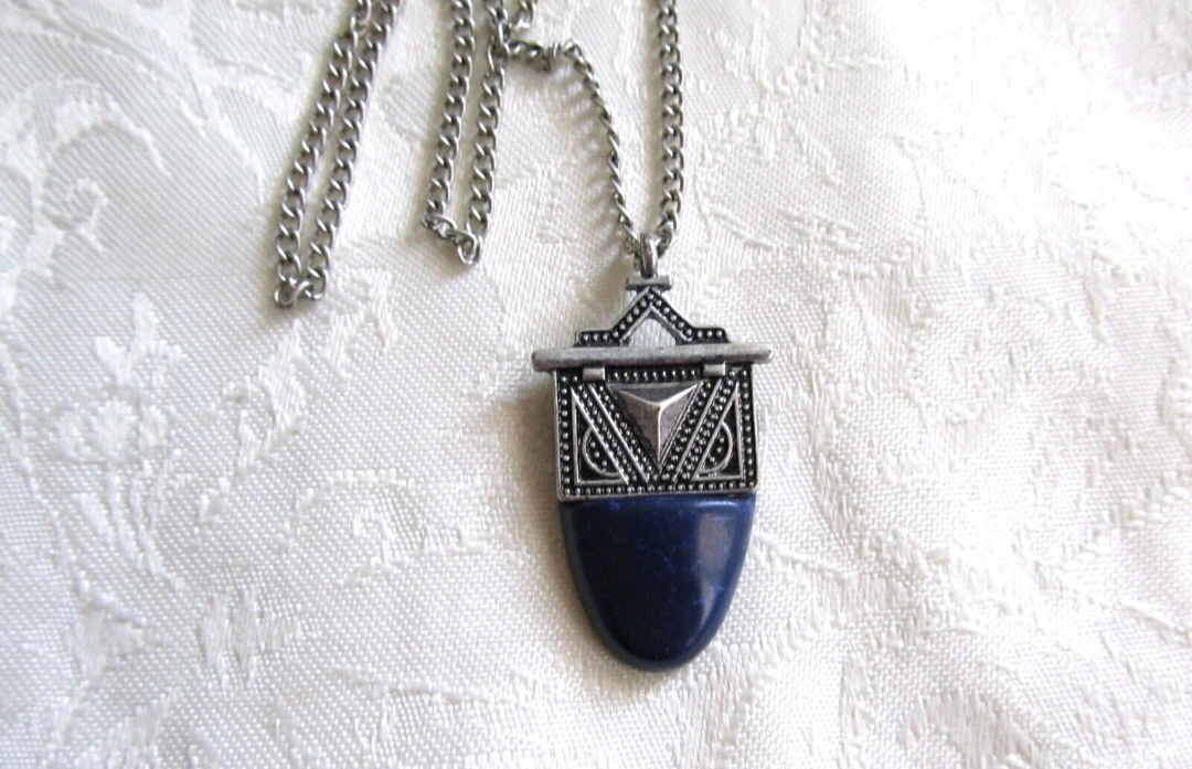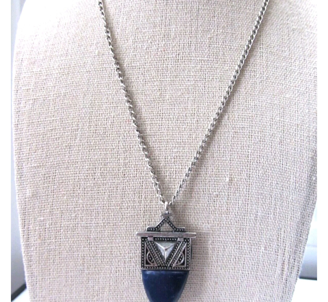 A vintage necklace with a purple stone pendant. The necklace has a silver chain. The pendant has a metal filigree detail, with a triangular shape at the top and bottom.Chain is 18 inches Beautiful Vintage necklace