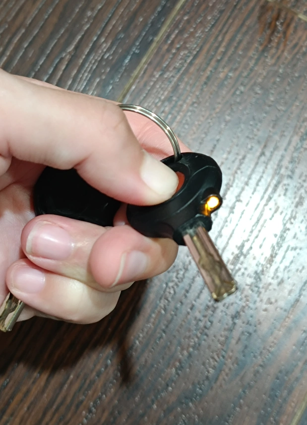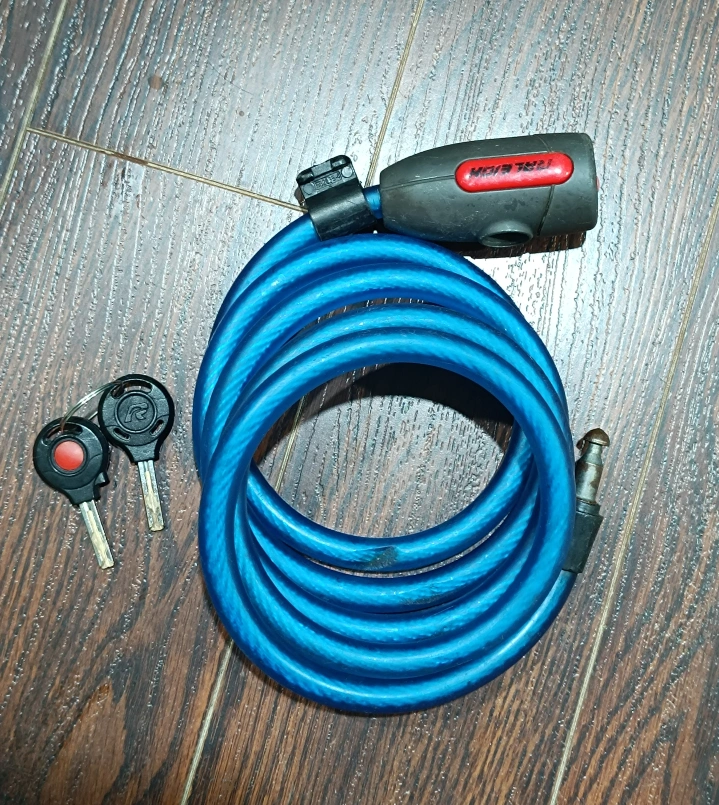 A blue security cable lock can be used on bike and scooter with anti-dust cap for protection of cylinder. It has a few scratches but still solid and reliable. Comes with two keys and one is lighted. Size: 12 mm x 6' (1.2 cm x 1.8 m)