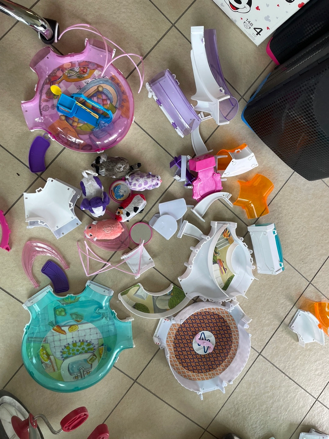 I am selling a hamster habitat play set, great for entertaining your little ones. There are multiple plastic pieces of different sizes and shapes, designed to create a fun environment.