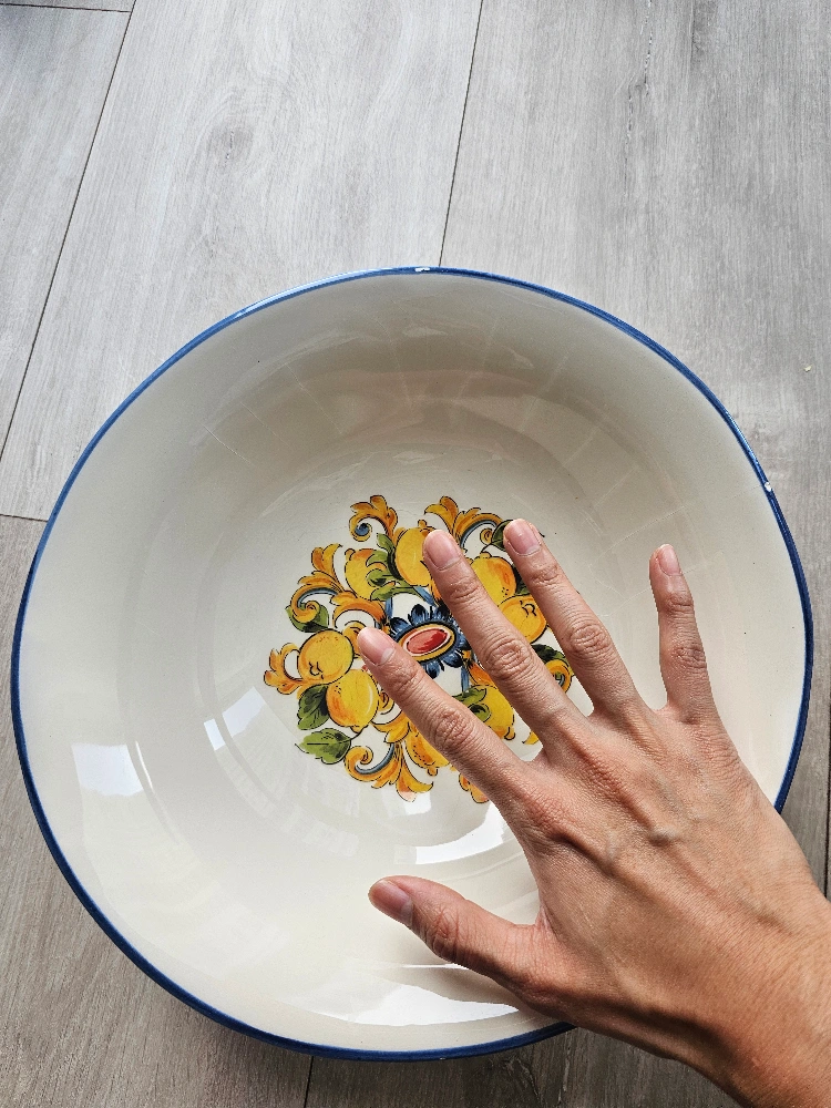A large, ceramic bowl. Features a white interior and a blue rim. Decorated with a colourful floral pattern. This bowl would be great for displaying fresh fruit, bringing joy to your kitchen space.