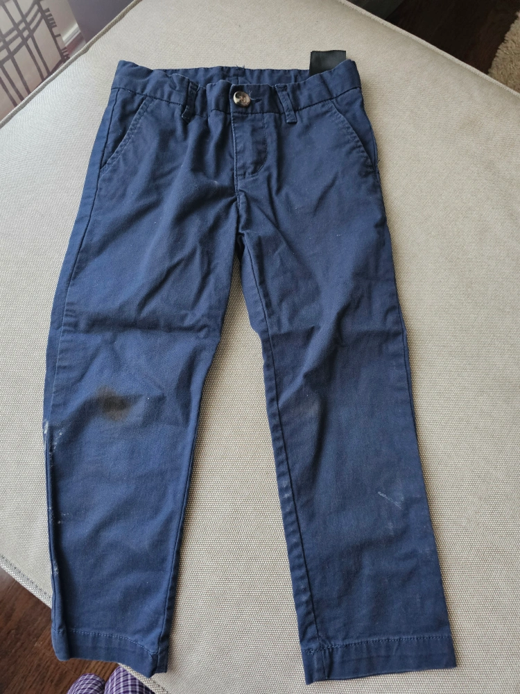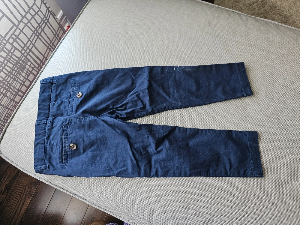 Navy blue pants for children. Features two front pockets and two back pockets. Offers a button and a zipper closure. A great item for a lovely day outside.