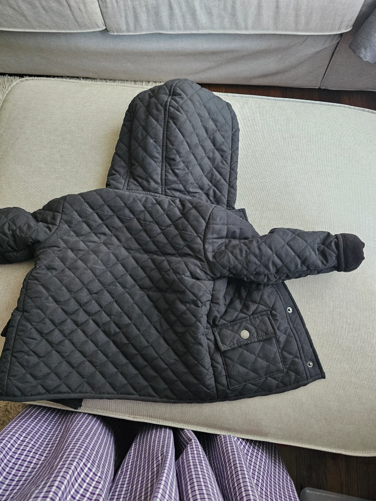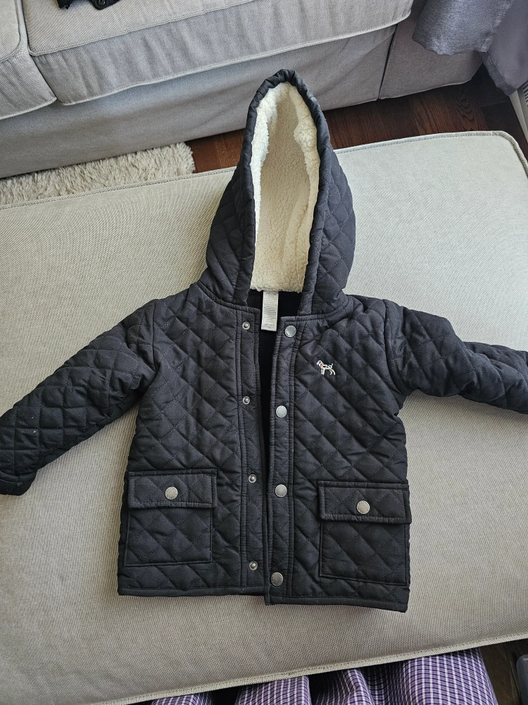 A children's jacket, black in colour. Quilted design on the exterior. Features a hood with a soft interior lining. Provides warmth and comfort, especially on those chilly days.