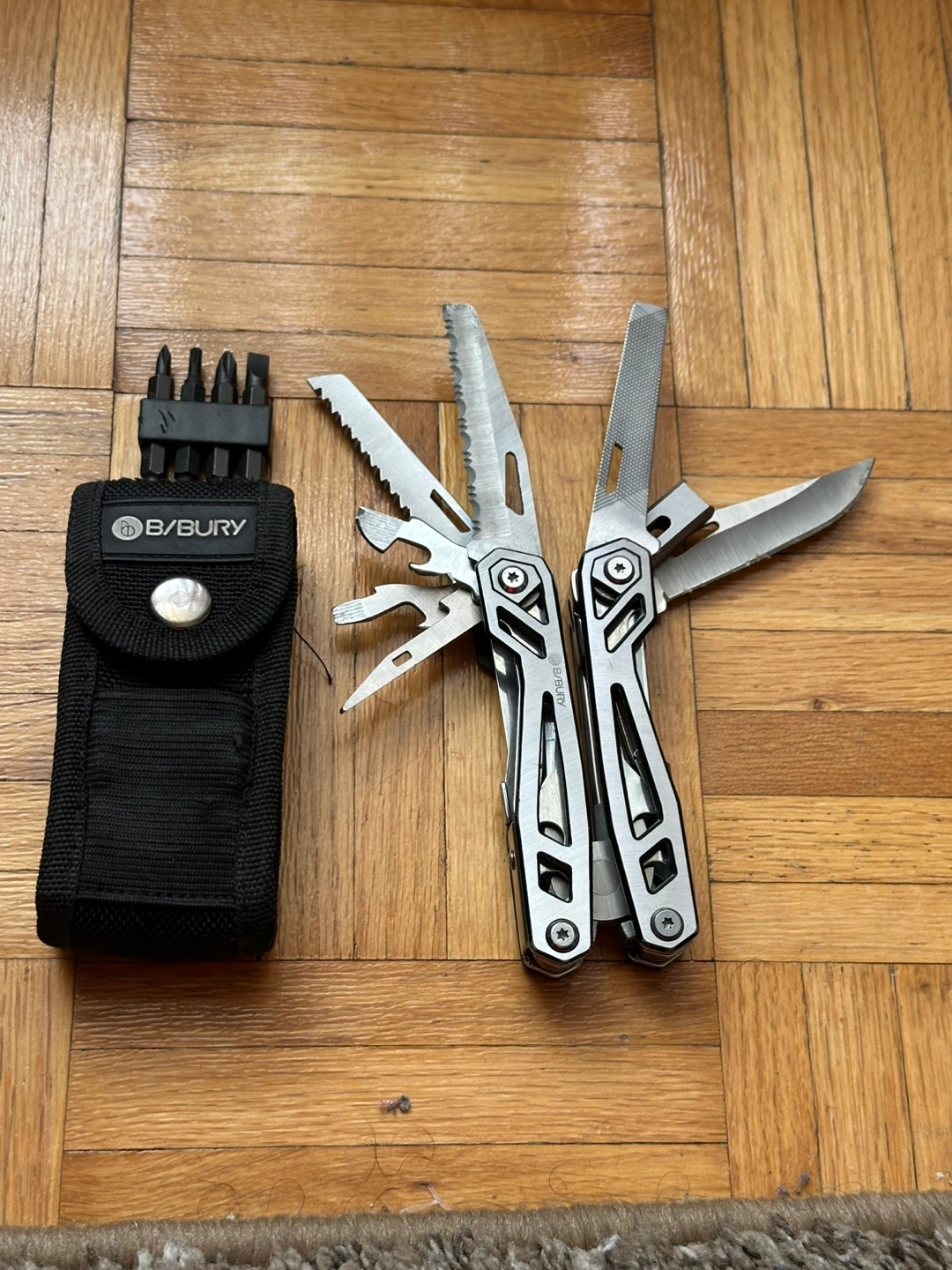 Multi-tool set and bits, with a black sheath. Various tools are present. It's the perfect thing to have at your side for any outdoor adventure.